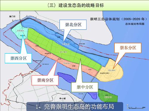 完善崇明生态岛的功能布局。在崇中分区建设以森林度假、休闲居住为主的中央森林区,崇东分区建设以生态居住、休闲运动、国际教育为主的科教研创区和门户景观区,崇南分区建设人口集聚的田园式新城和新市镇区,崇北分区建设以生态农业为主的规模农业区和战略储备区,崇西分区建设以国际会议、滨湖度假为特色的生态休闲区。