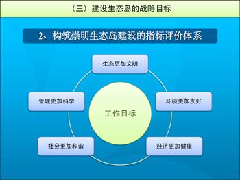 构筑崇明生态岛建设的指标评价体系。按照生态更加文明、环境更加友好、经济更加健康、社会更加和谐、管理更加科学的总体思路,接轨国际生态理念,结合崇明发展实际,建立一套强化生态保障、加强环境保护、优化产业结构、改善民生质量、提升管理水平的指标评价体系,有计划、有步骤地系统推进崇明生态岛的建设。