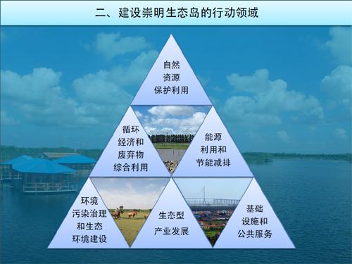 按照建设世界级生态岛的总体目标,以科学的指标评价体系为指导,大力推进资源、环境、产业、基础设施和社会服务等领域的协调发展,把生态保护和环境建设放在更加突出的位置,加强项目建设、措施管理和政策配套,力争到2020年形成崇明现代化生态岛建设的初步框架。