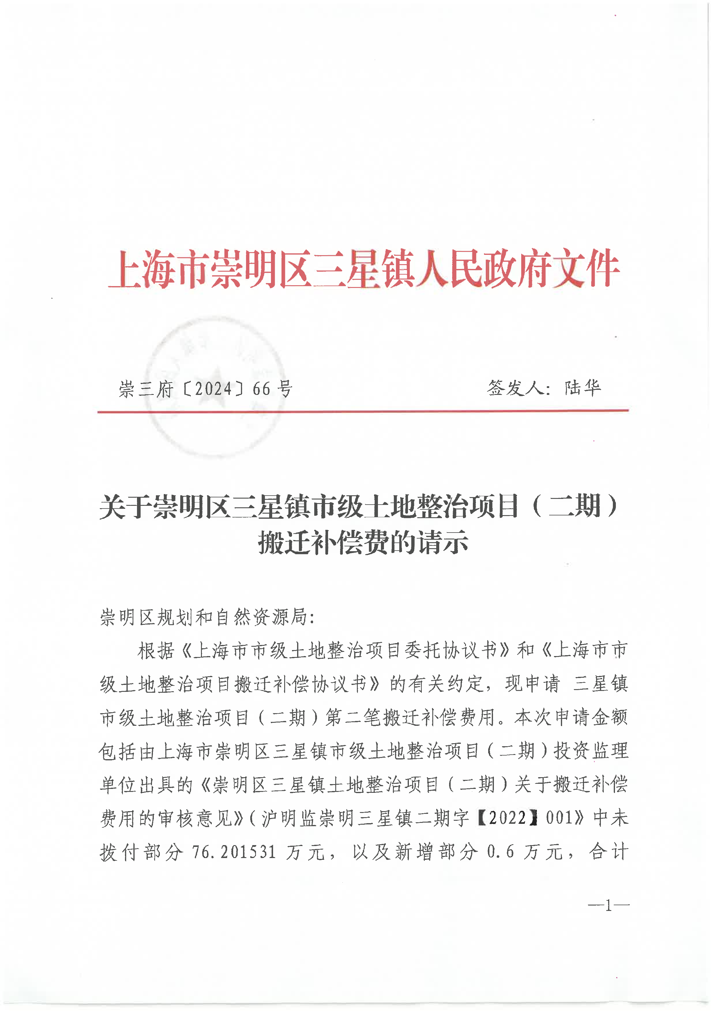根据《上海市市级土地整治项目委托协议书》和《上海市市级土地整治项目搬迁补偿协议书》的有关约定,现提请拨给崇明区三星镇市级土地整治项目(二期)搬迁补偿费用。