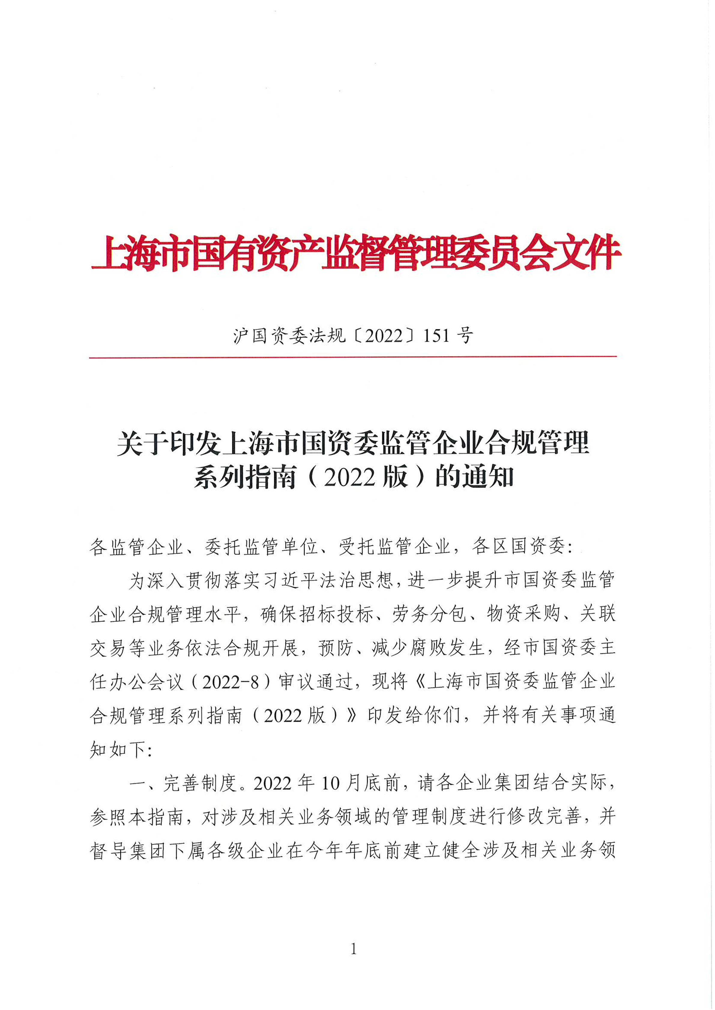 现将市国资委《关于印发上海市国资委监管企业合规管理系列指南(2022版)的通知》(沪国资委法规〔2022〕151号)转发给你们,请各企业参照执行。