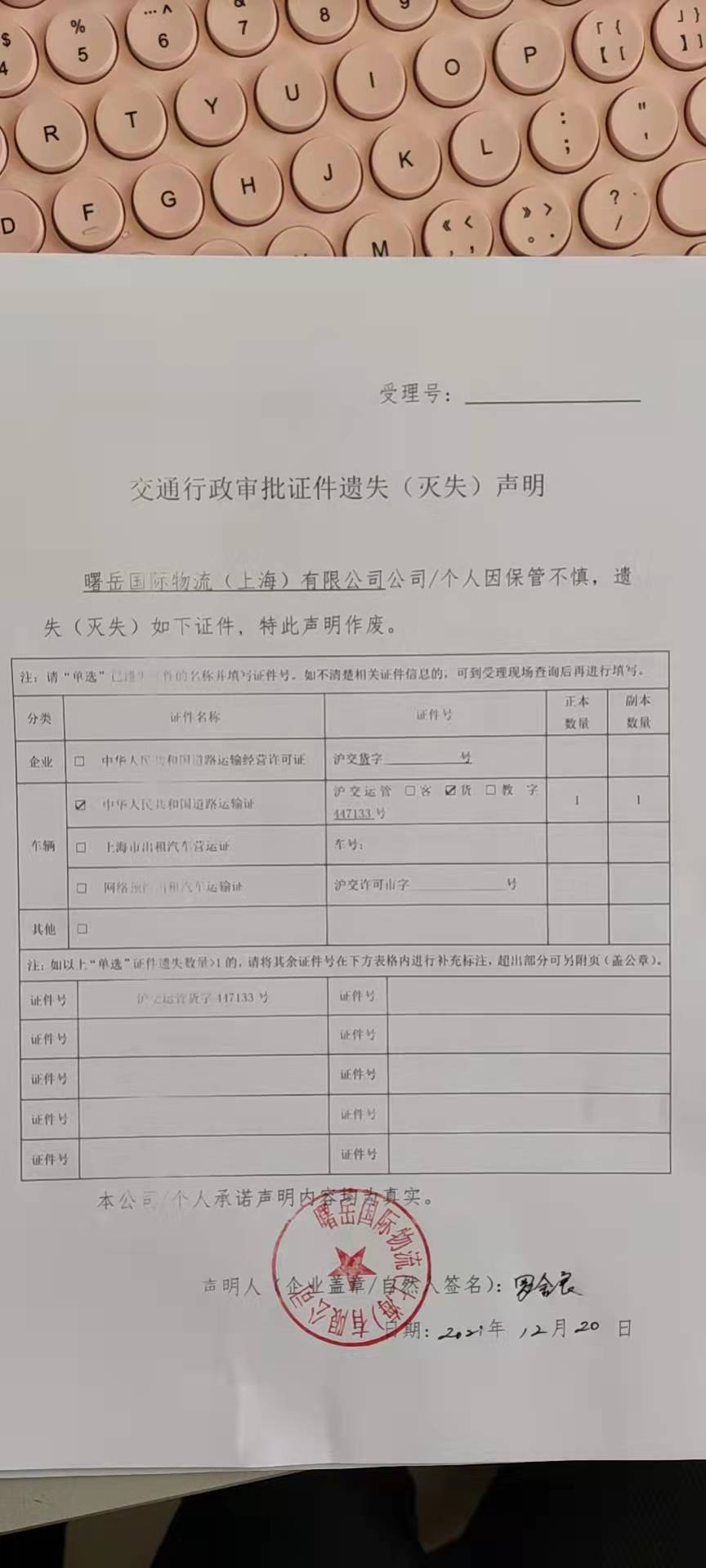 曙岳国际物流(上海)有限公司道路运输证(证件号:沪交运管货字447133)遗失声明