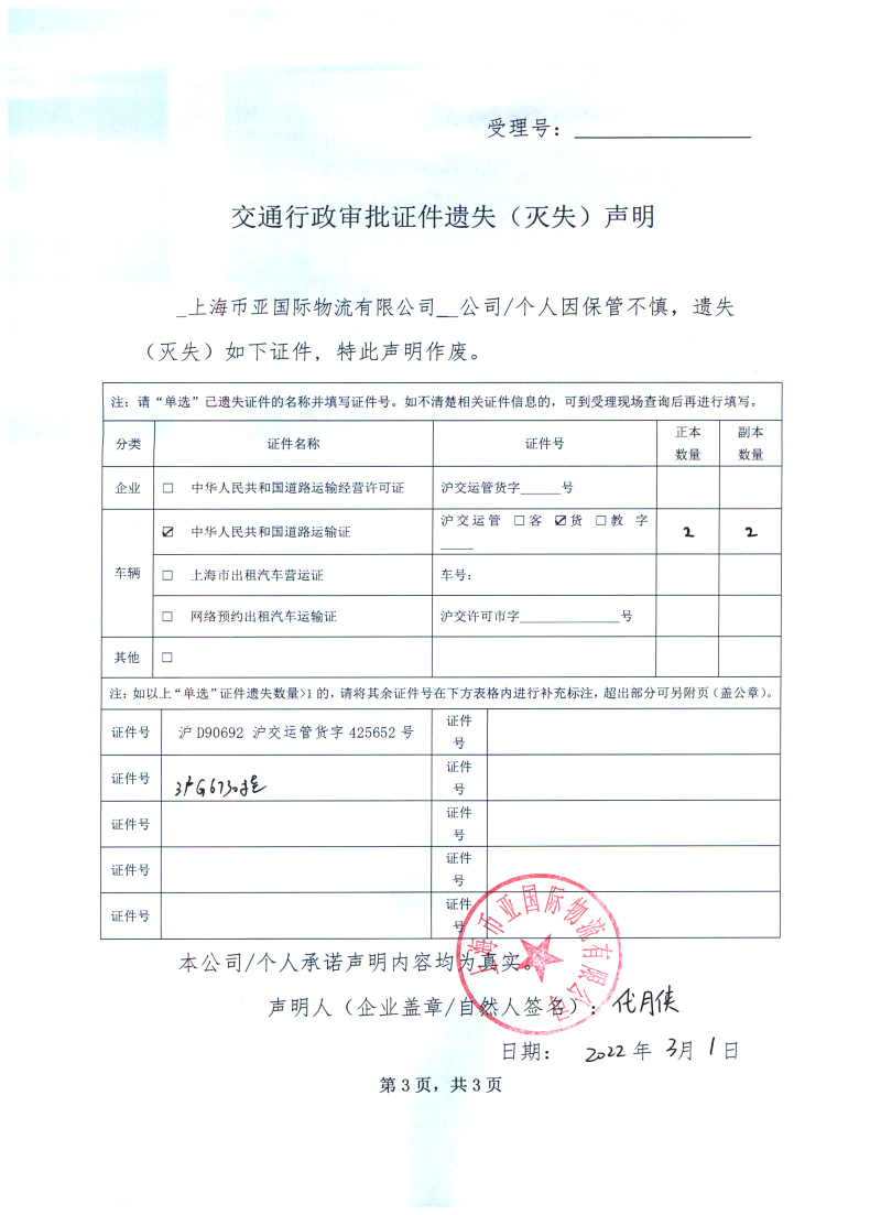 上海币亚国际物流有限公司道路运输证(证件号:沪交运管货字425652等2本)遗失声明