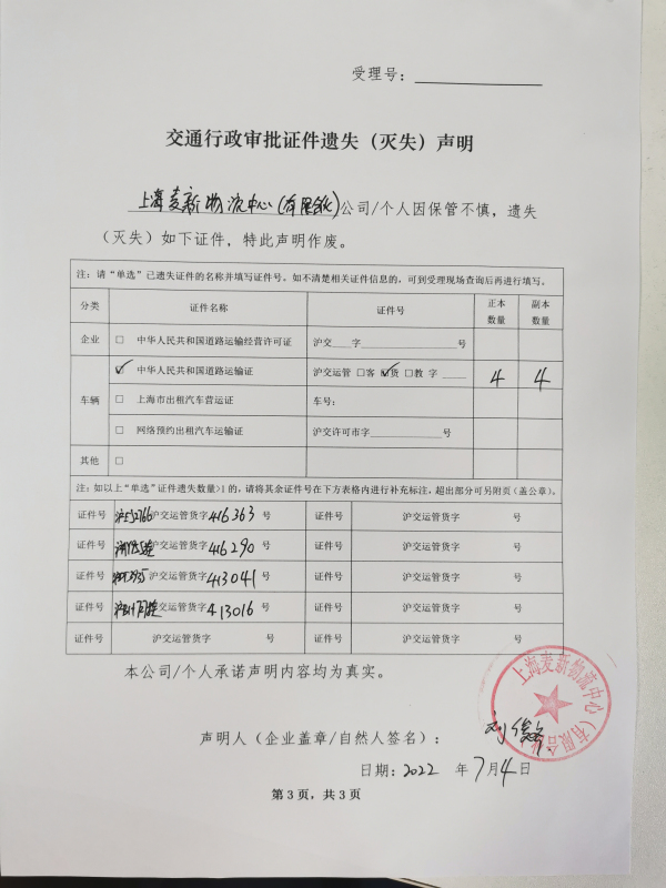 上海麦新物流中心(有限合伙)道路运输证(证件号:沪交运管货字416363等4本)遗失声明