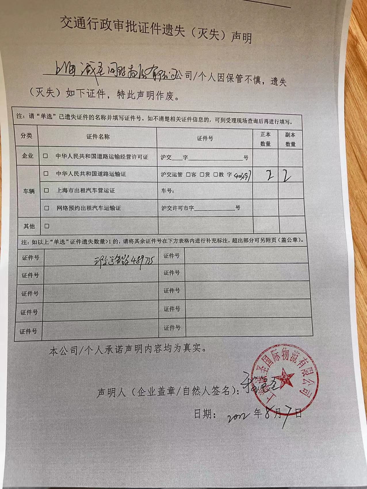 上海诚圣国际物流有限公司道路运输证(证件号:沪交运管货字403197等2本)遗失声明