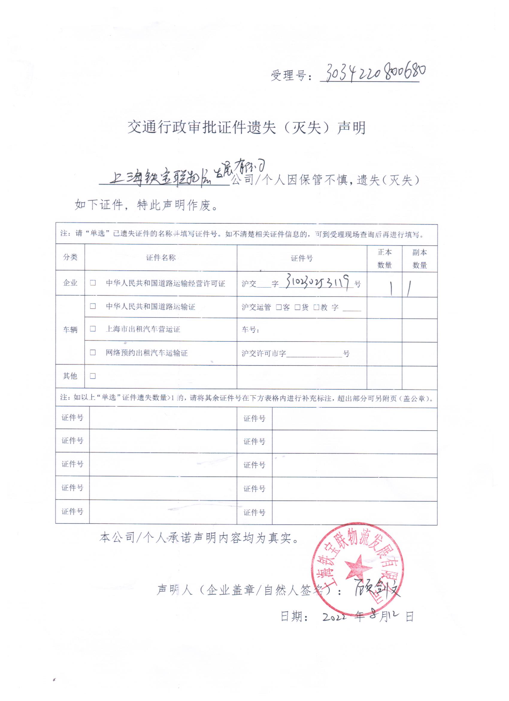 上海铁宝联物流发展有限公司道路运输经营许可证(证件号:沪崇310230253119)遗失声明