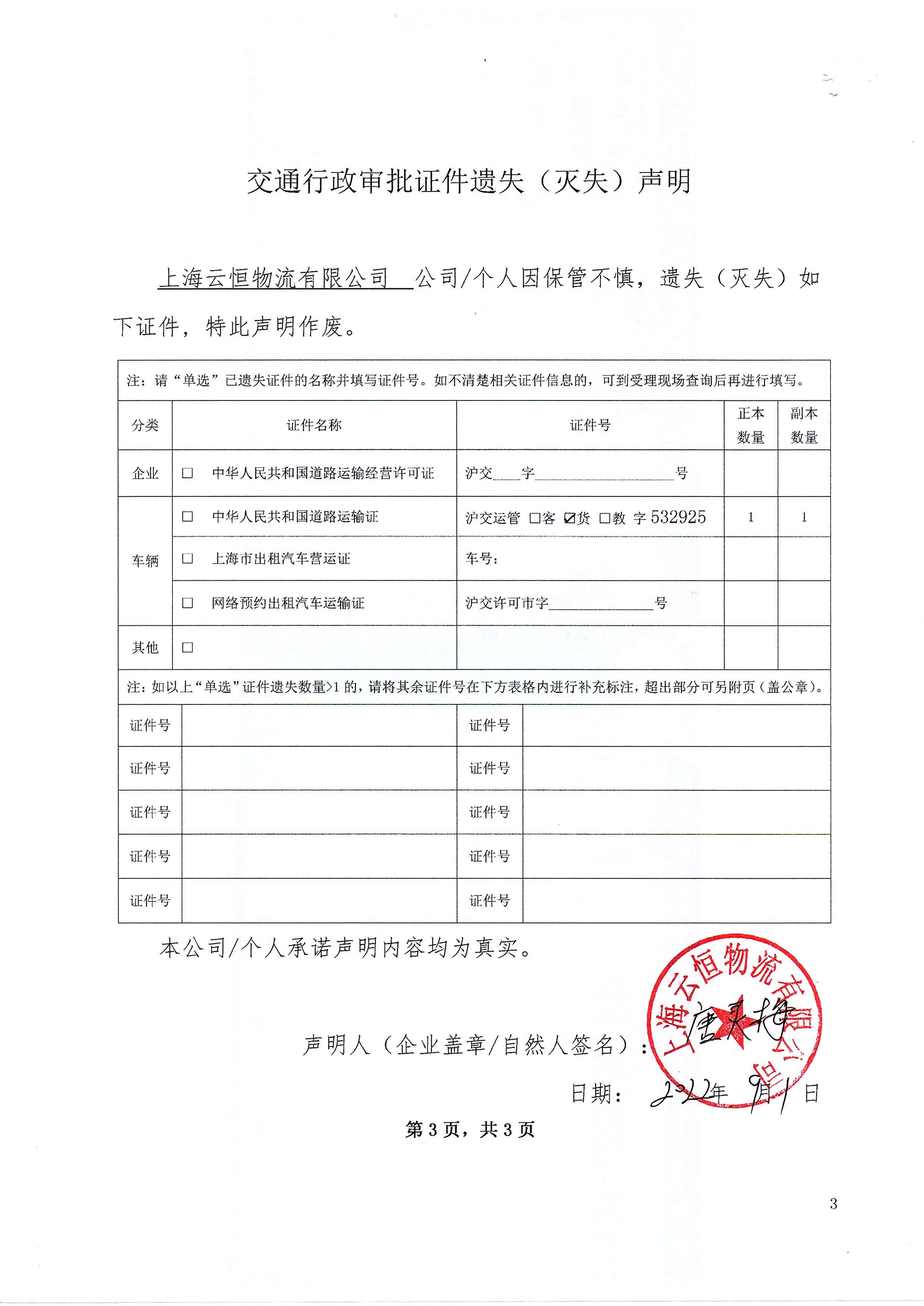 上海云恒物流有限公司道路运输证(证件号:沪交运管货字532925)遗失声明