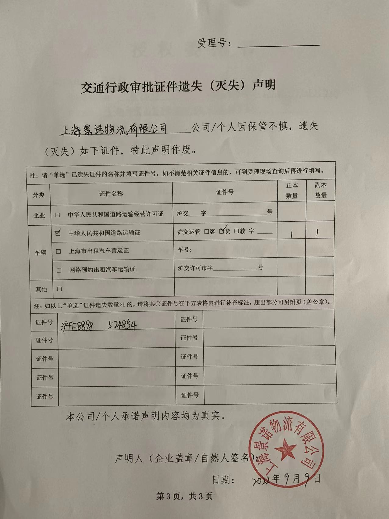 上海景诺物流有限公司道路运输证(证件号:沪交运管货字524854)遗失声明