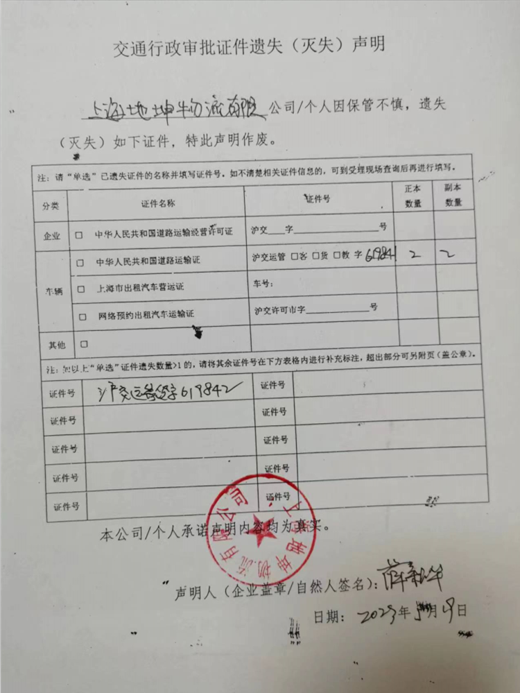 上海地坤物流有限公司道路运输证(证件号:沪交运管货字619841等2本)遗失声明