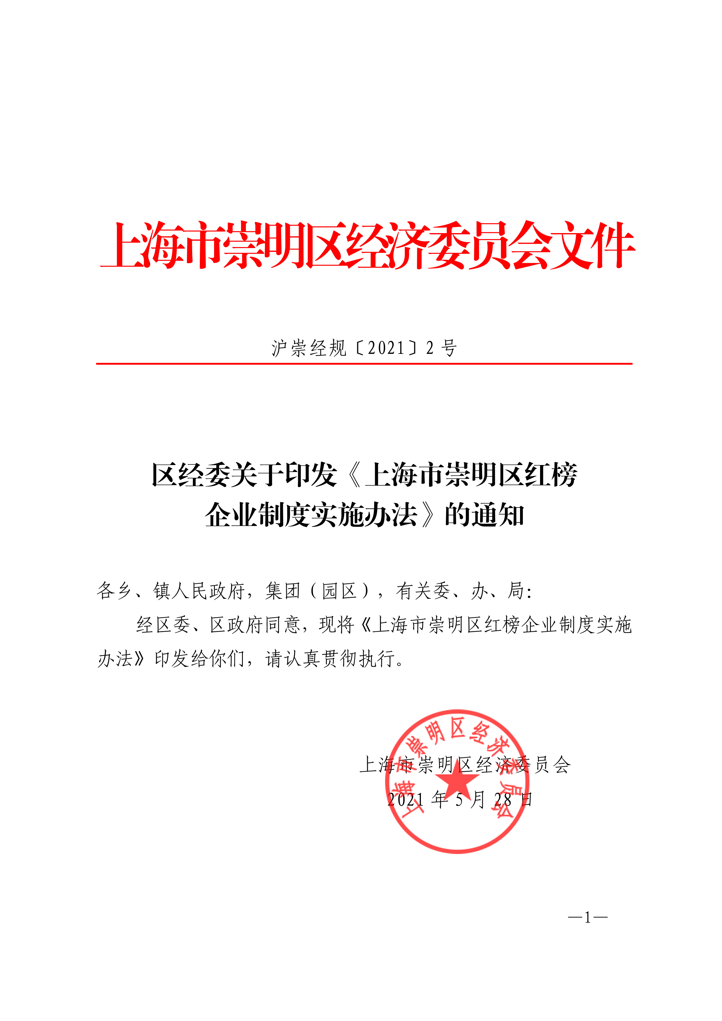 经区委、区政府同意,现将《上海市崇明区红榜企业制度实施办法》印发给你们,请认真贯彻执行。