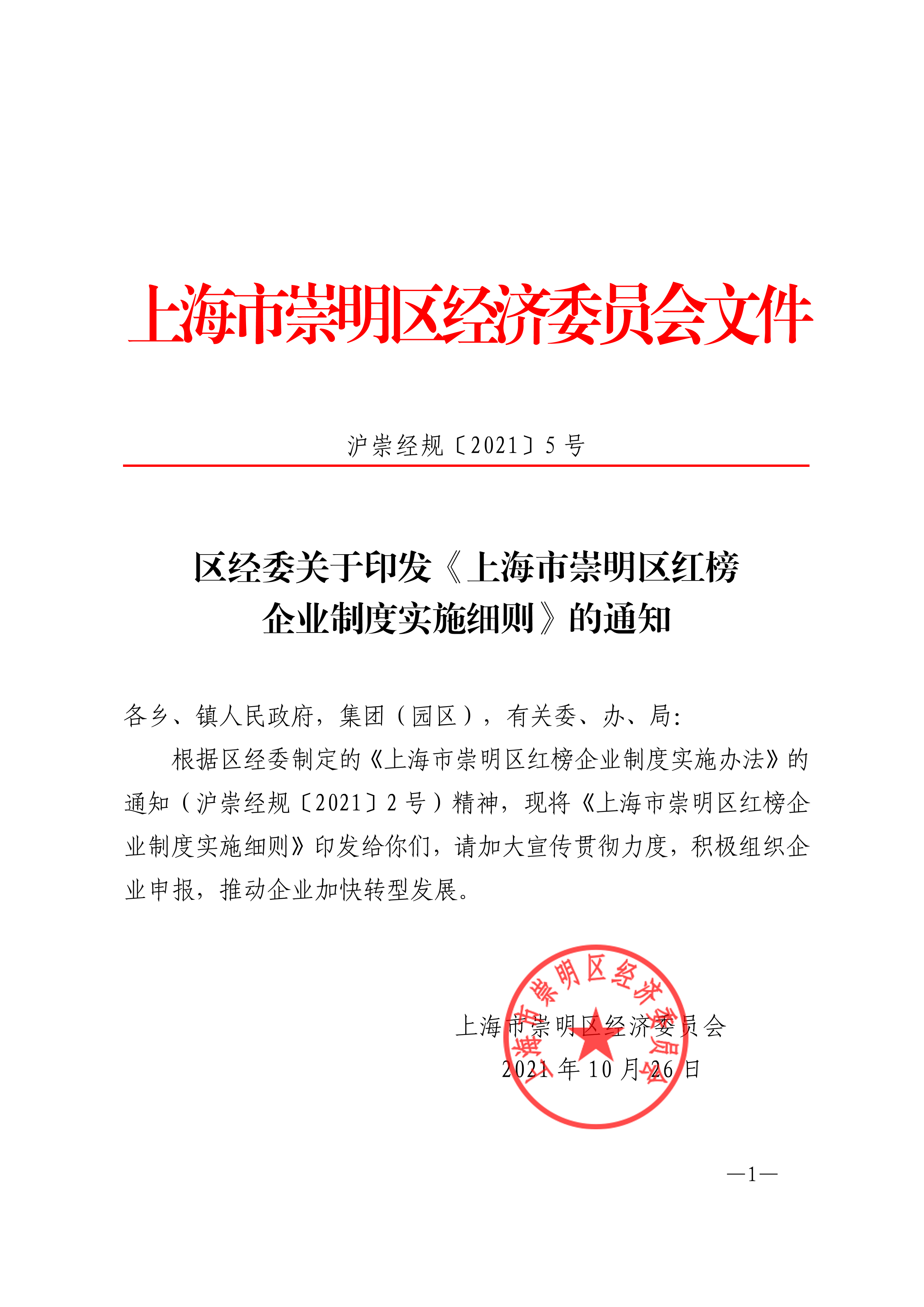 根据区经委制定的《上海市崇明区红榜企业制度实施办法》的通知(沪崇经规〔2021〕2号)精神,现将《上海市崇明区红榜企业制度实施细则》印发给你们,请加大宣传贯彻力度,积极组织企业申报,推动企业加快转型发展。