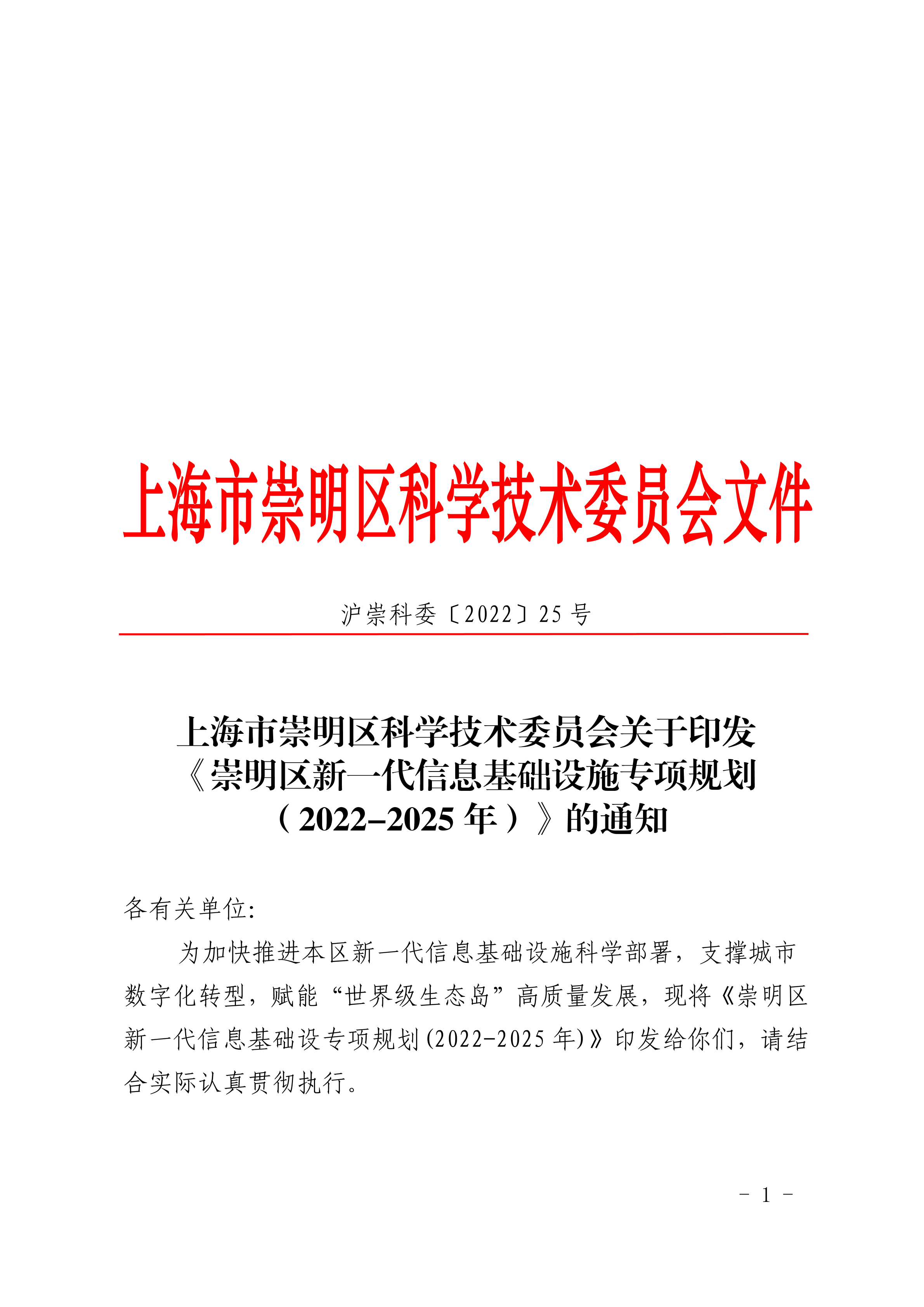 为加快推进本区新一代信息基础设施科学部署,支撑城市数字化转型,赋能“世界级生态岛”高质量发展,现将《崇明区新一代信息基础设专项规划(2022-2025年)》印发给你们,请结合实际认真贯彻执行。