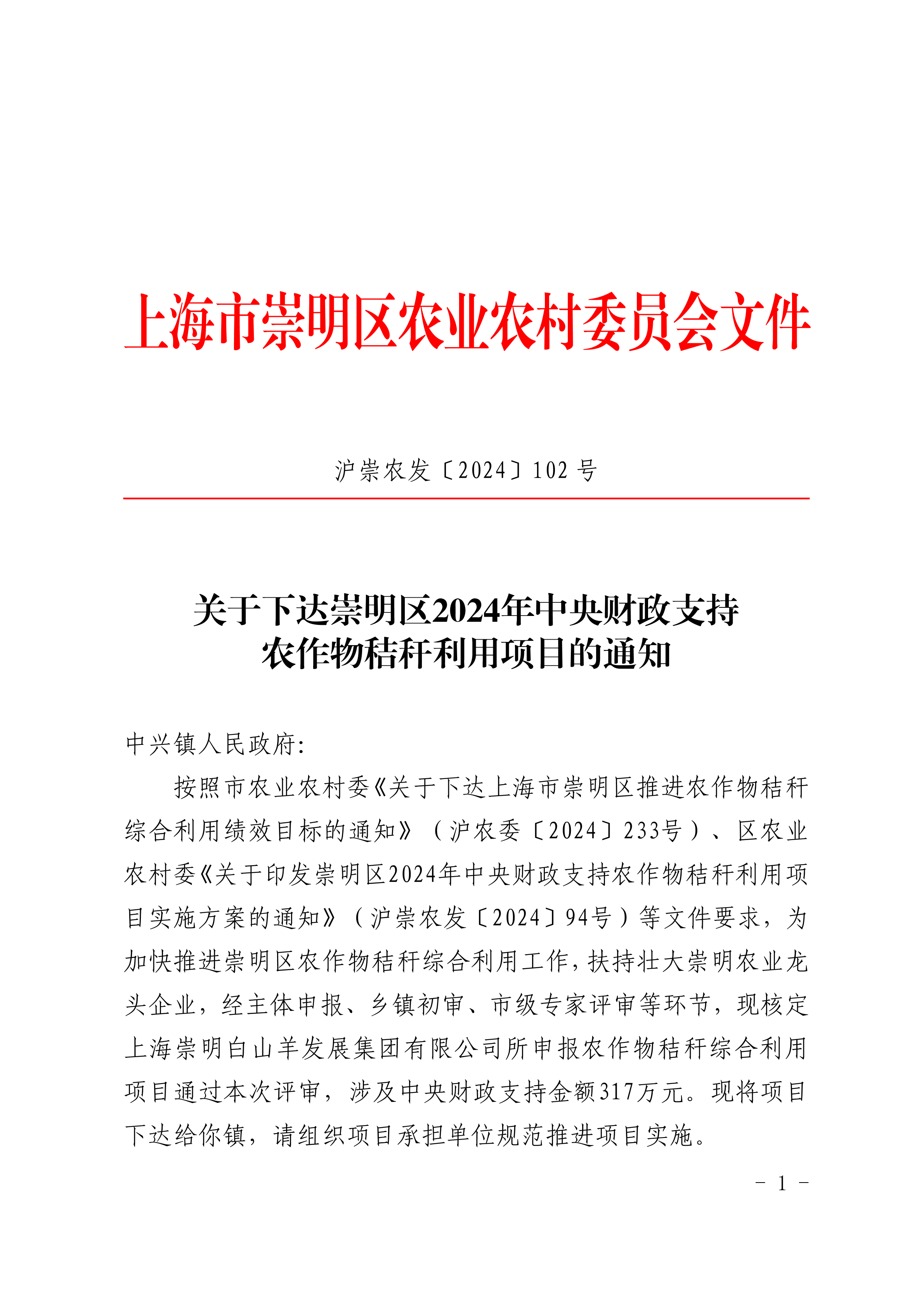 按照市农业农村委《关于下达上海市崇明区推进农作物秸秆综合利用绩效目标的通知》(沪农委〔2024〕233号)、区农业农村委《关于印发崇明区2024年中央财政支持农作物秸秆利用项目实施方案的通知》(沪崇农发〔2024〕94号)等文件要求,为加快推进崇明区农作物秸秆综合利用工作,扶持壮大崇明农业龙头企业,经主体申报、乡镇初审、市级专家评审等环节,现核定上海崇明白山羊发展集团有限公司所申报农作物秸秆综合利用项目通过本次评审,涉及中央财政支持金额317万元。现将项目下达给你镇,请组织项目承担单位规范推进项目实施。