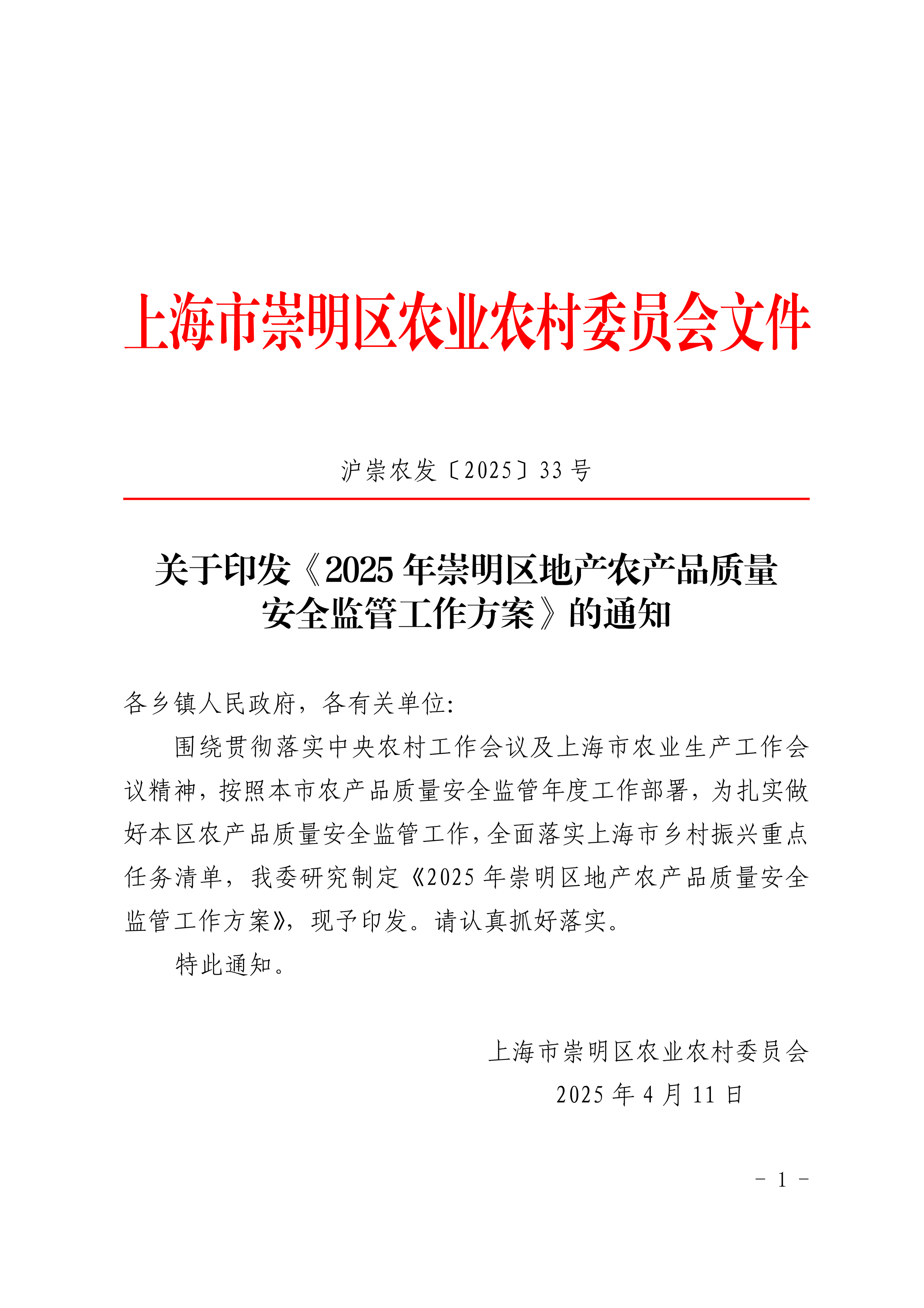 围绕贯彻落实中央农村工作会议及上海市农业生产工作会议精神,按照本市农产品质量安全监管年度工作部署,为扎实做好本区农产品质量安全监管工作,全面落实上海市乡村振兴重点任务清单,我委研究制定《2025年崇明区地产农产品质量安全监管工作方案》,现予印发。请认真抓好落实。