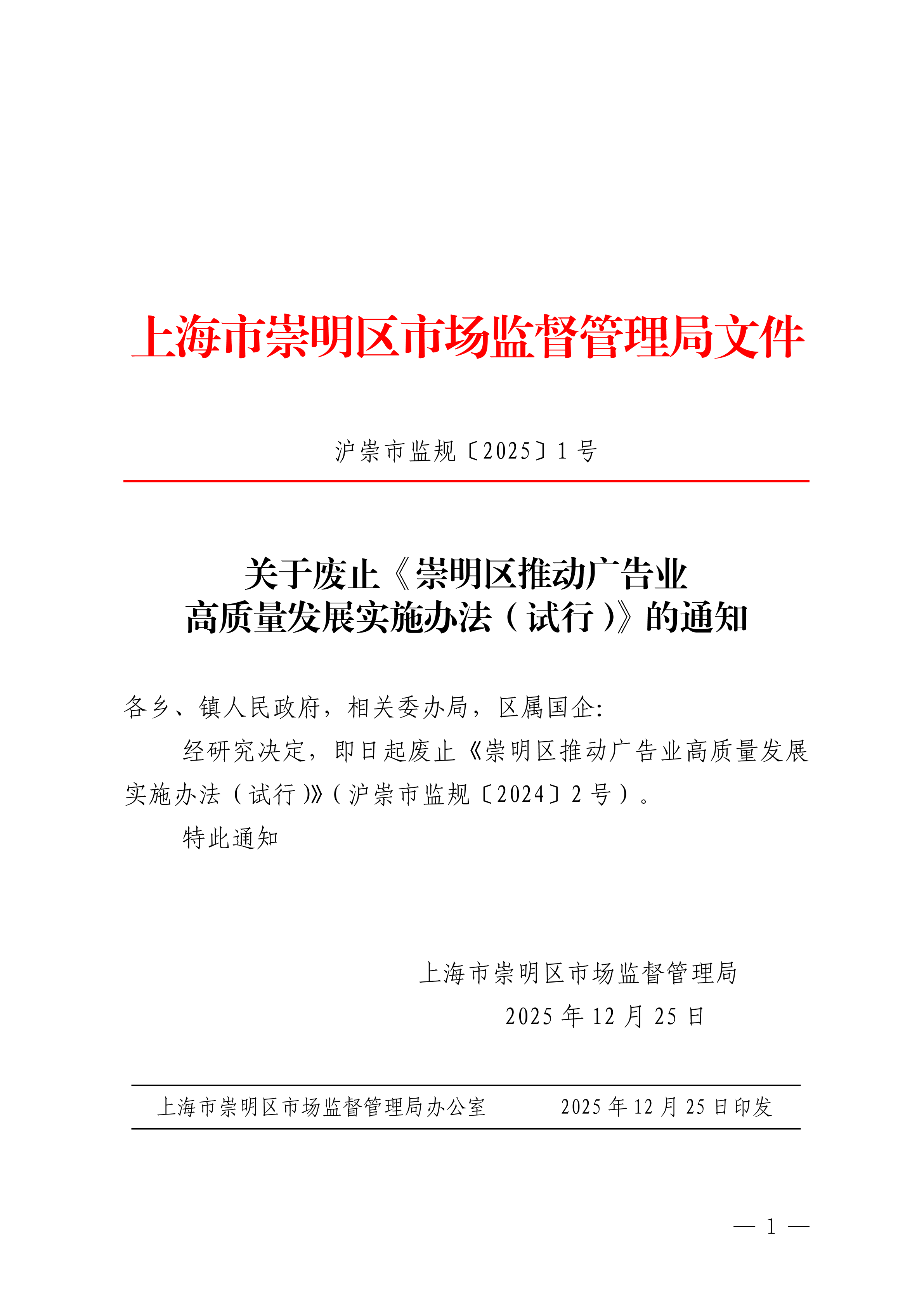 经研究决定,即日起废止《崇明区推动广告业高质量发展实施办法(试行)》(沪崇市监规〔2024〕2号)。