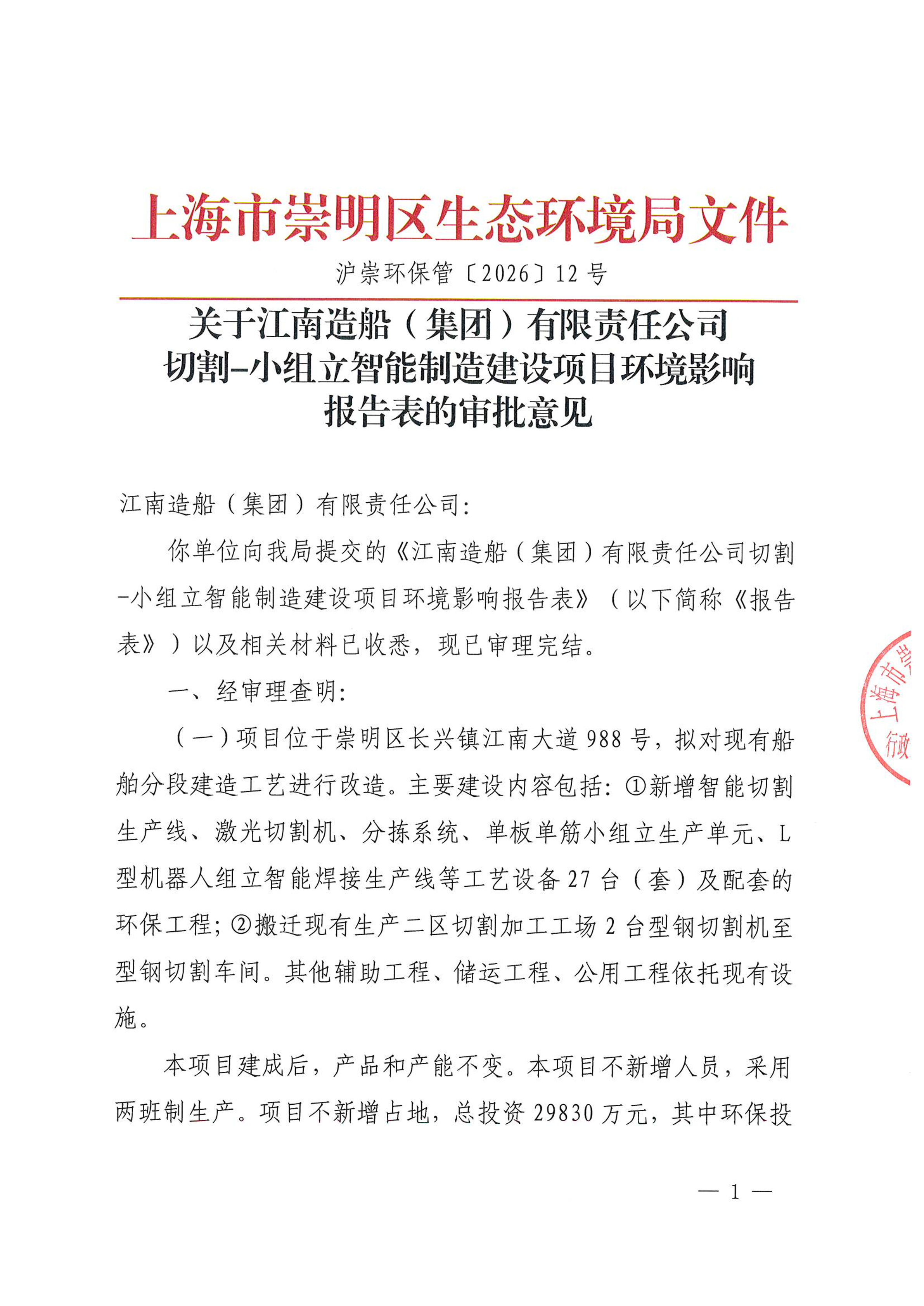 你单位向我局提交的《江南造船(集团)有限责任公司切割-小组立智能制造建设项目环境影响报告表》(以下简称《报告表》)以及相关材料已收悉,现已审理完结。