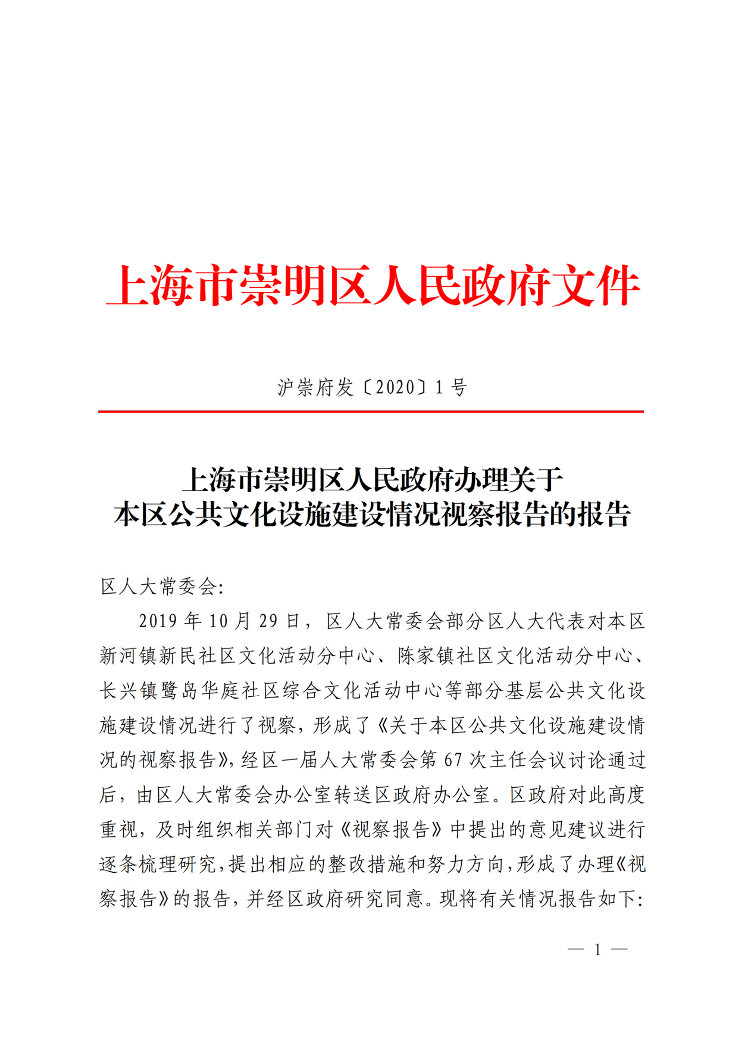 2019年10月29日,区人大常委会部分区人大代表对本区新河镇新民社区文化活动分中心、陈家镇社区文化活动分中心、长兴镇鹭岛华庭社区综合文化活动中心等部分基层公共文化设施建设情况进行了视察,形成了《关于本区公共文化设施建设情况的视察报告》,经区一届人大常委会第67次主任会议讨论通过后,由区人大常委会办公室转送区政府办公室。区政府对此高度重视,及时组织相关部门对《视察报告》中提出的意见建议进行逐条梳理研究,提出相应的整改措施和努力方向,形成了办理《视察报告》的报告,并经区政府研究同意。现将有关情况报告如下: