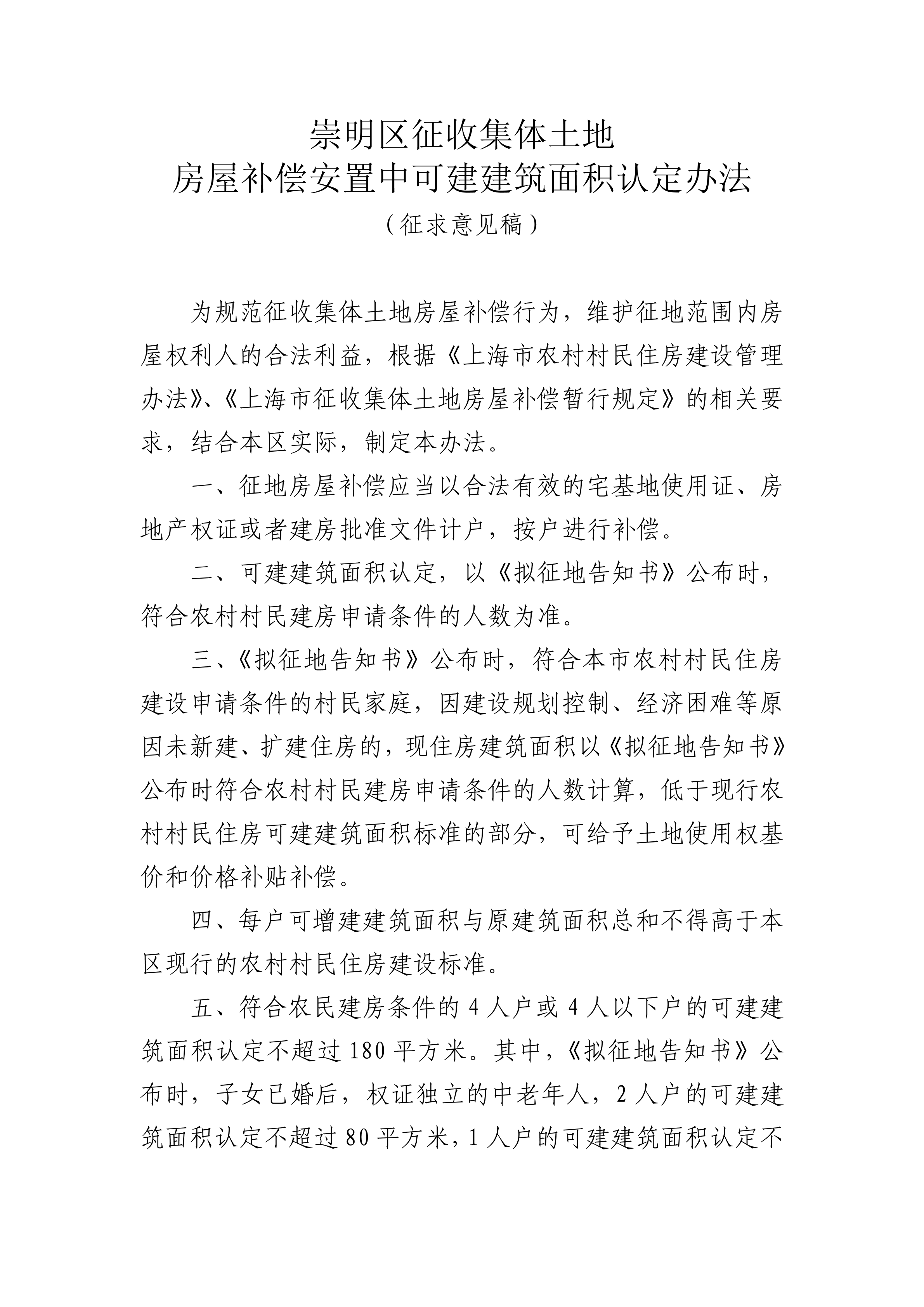 为进一步规范崇明区集体土地征收补偿工作,维护被征收相关主体的合法权益,促进社会经济和谐发展。现根据相关法律法规和我区集体土地上房屋征收实际工作的需要,现将《关于制定本区征收集体土地房屋补偿标准等有关问题的意见(征求意见稿)》(详见附件)、《崇明区集体土地征地房屋补偿安置中可建建筑面积认定办法(征求意见稿)》(详见附件)公开征求意见,有关事宜公告如下: