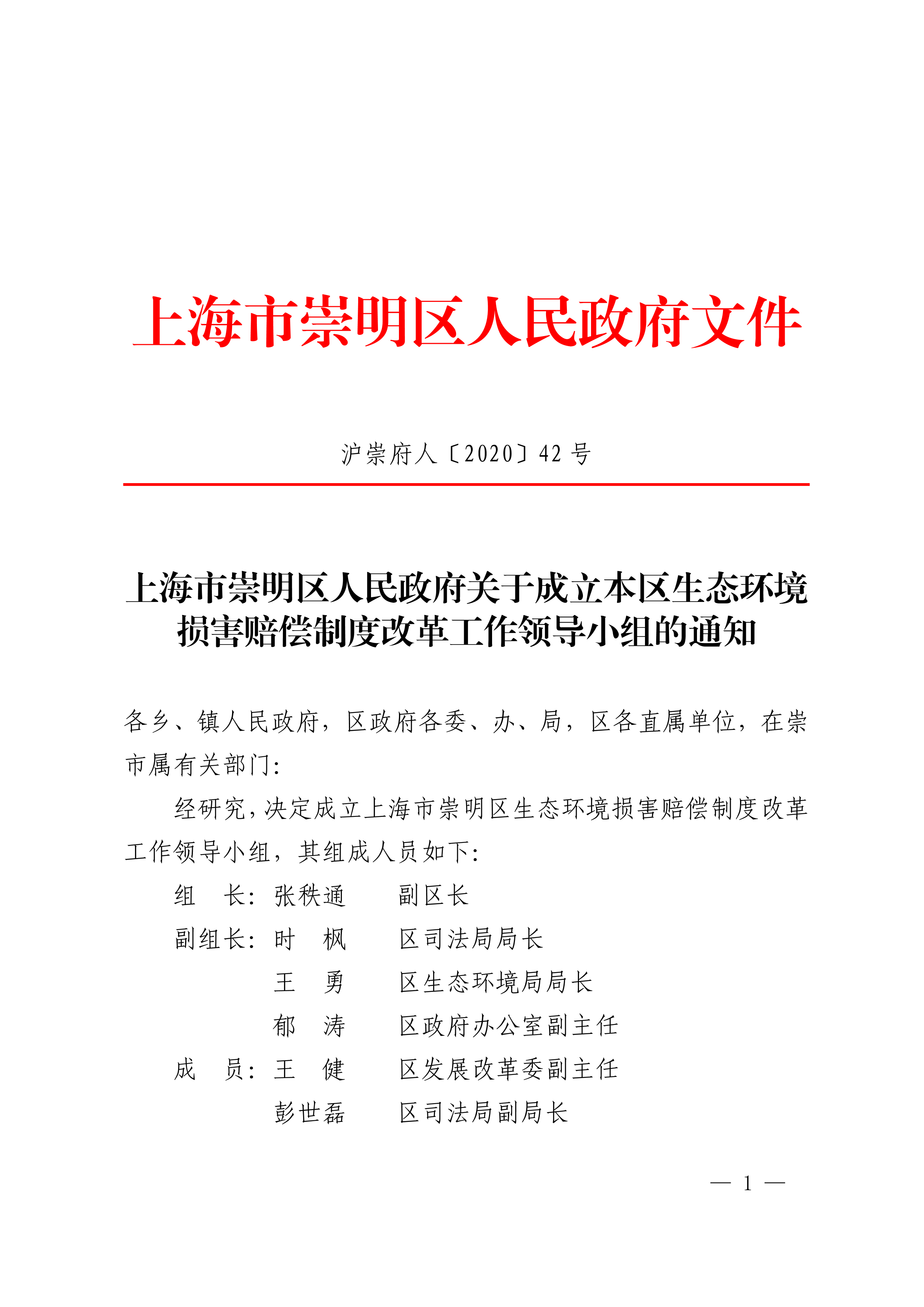 经研究,决定成立上海市崇明区生态环境损害赔偿制度改革工作领导小组,其组成人员如下:
