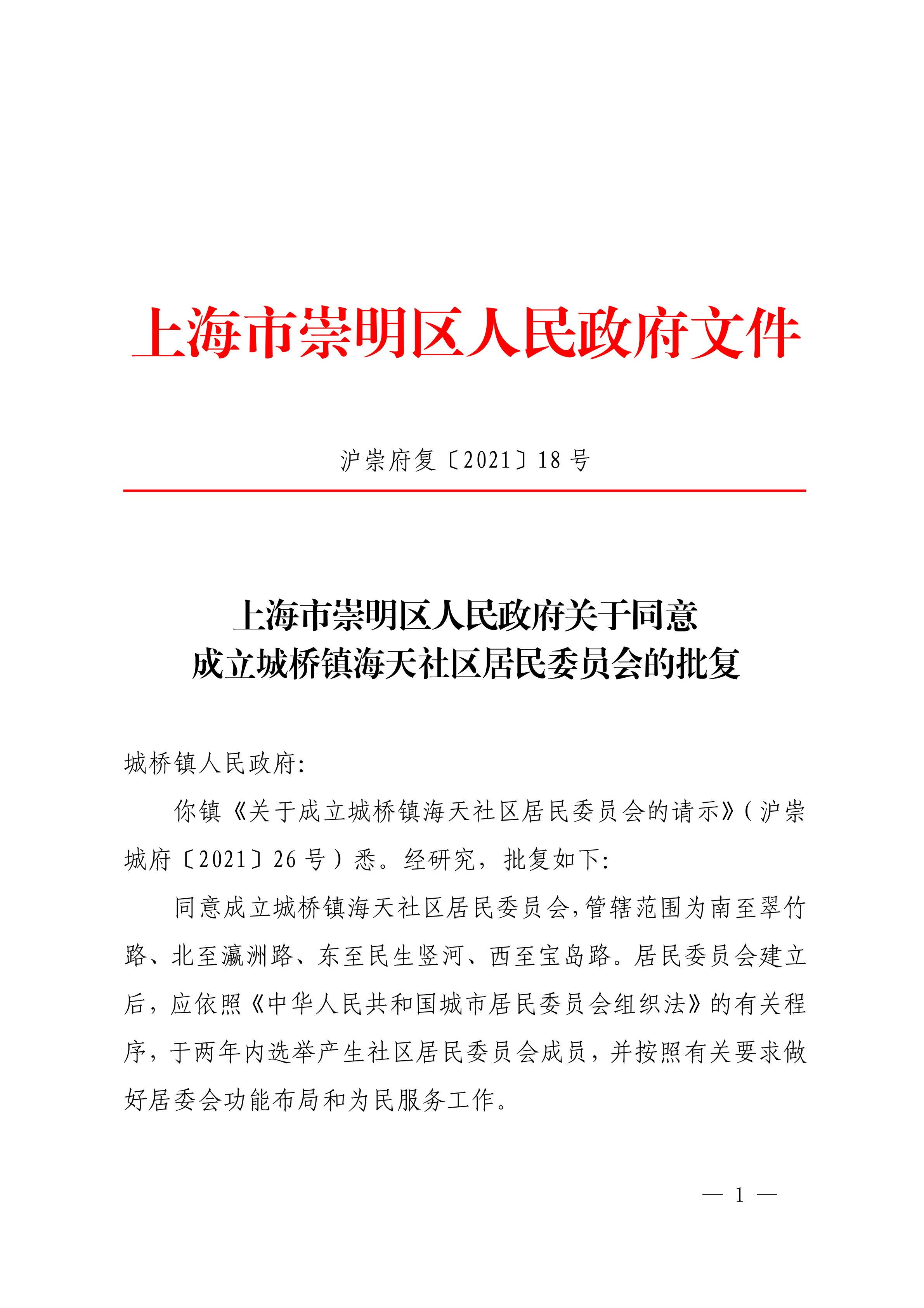 你镇《关于成立城桥镇海天社区居民委员会的请示》(沪崇城府〔2021〕26号)悉。经研究,批复如下: