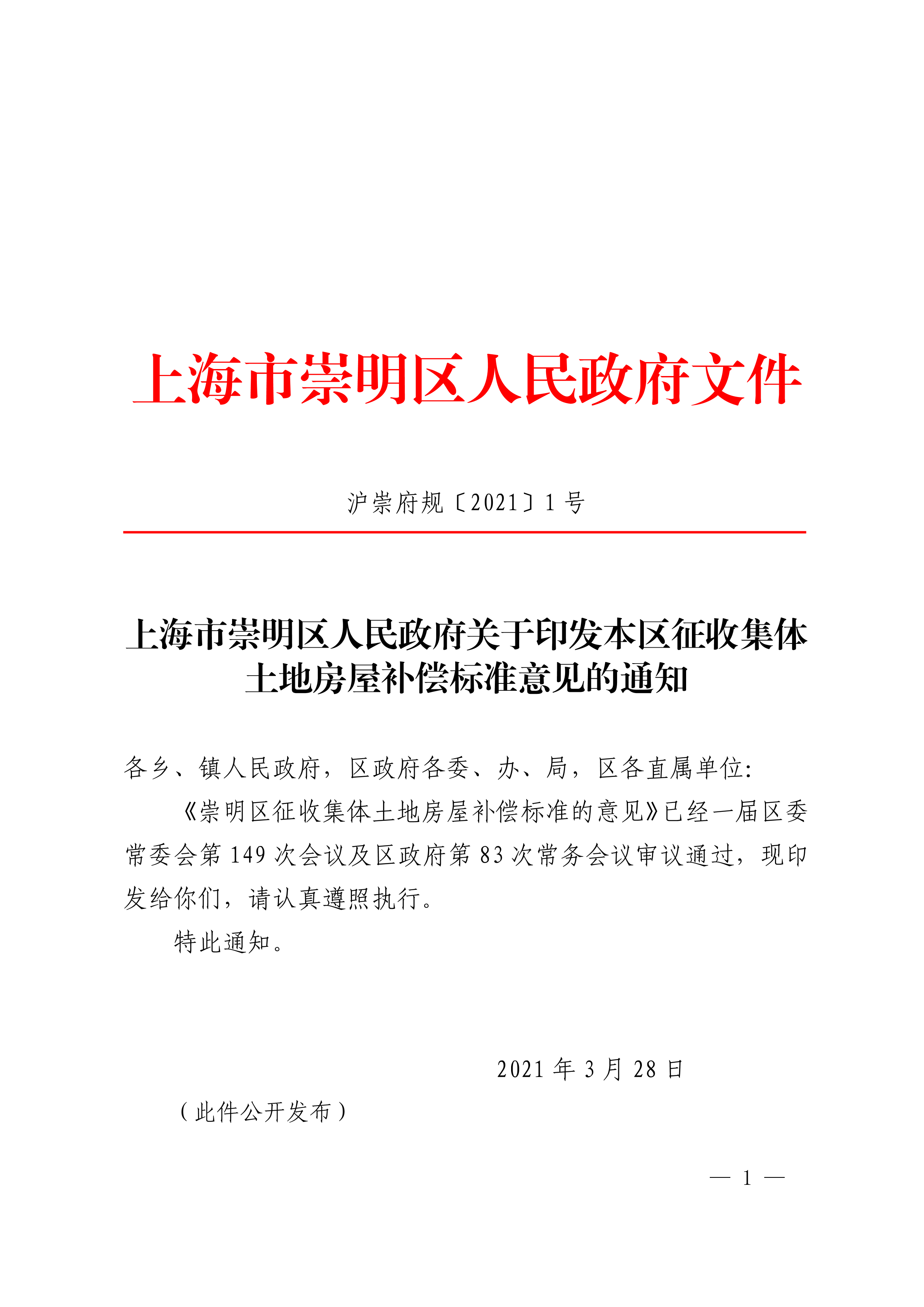 《崇明区征收集体土地房屋补偿标准的意见》已经一届区委常委会第149次会议及区政府第83次常务会议审议通过,现印发给你们,请认真遵照执行。