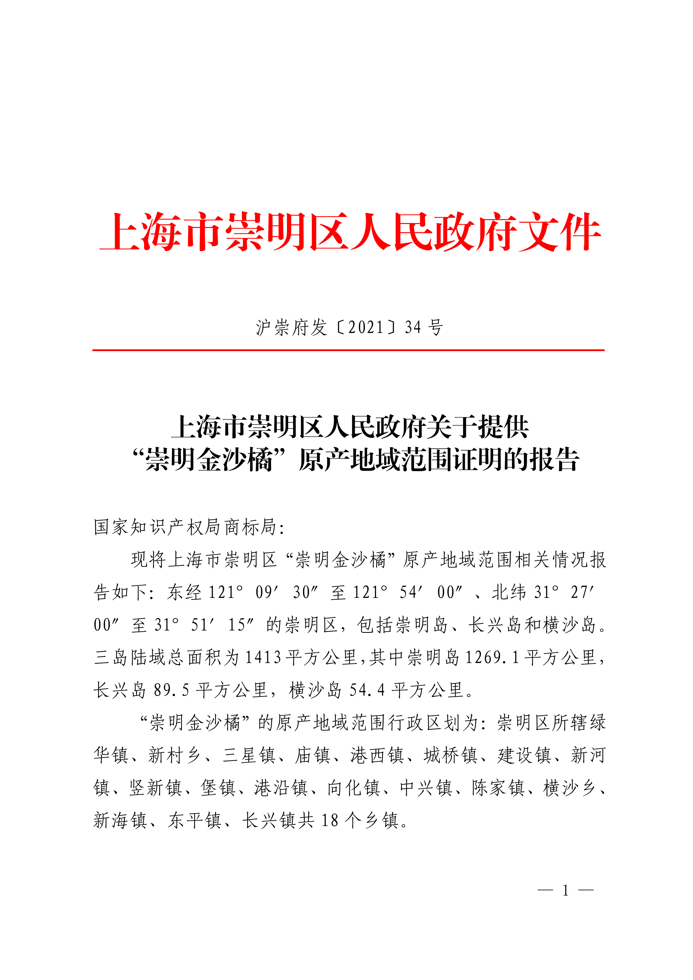 现将上海市崇明区“崇明金沙橘”原产地域范围相关情况报告如下:东经121°09′30″至121°54′00″、北纬31°27′00″至31°51′15″的崇明区,包括崇明岛、长兴岛和横沙岛。三岛陆域总面积为1413平方公里,其中崇明岛1269.1平方公里,长兴岛89.5平方公里,横沙岛54.4平方公里。