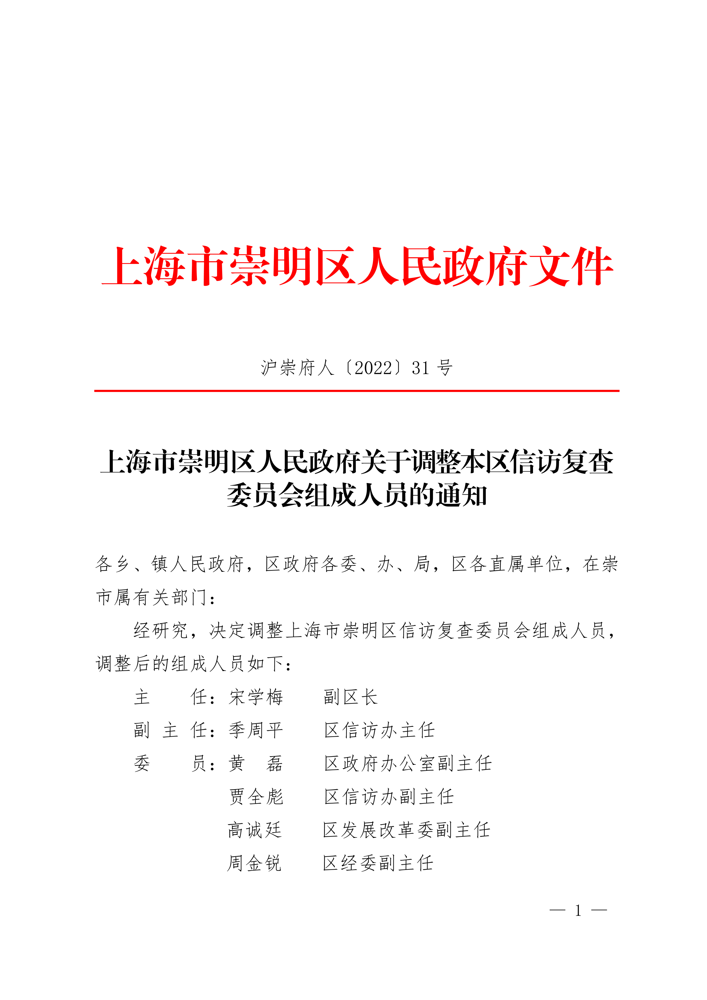 经研究,决定调整上海市崇明区信访复查委员会组成人员,调整后的组成人员如下: