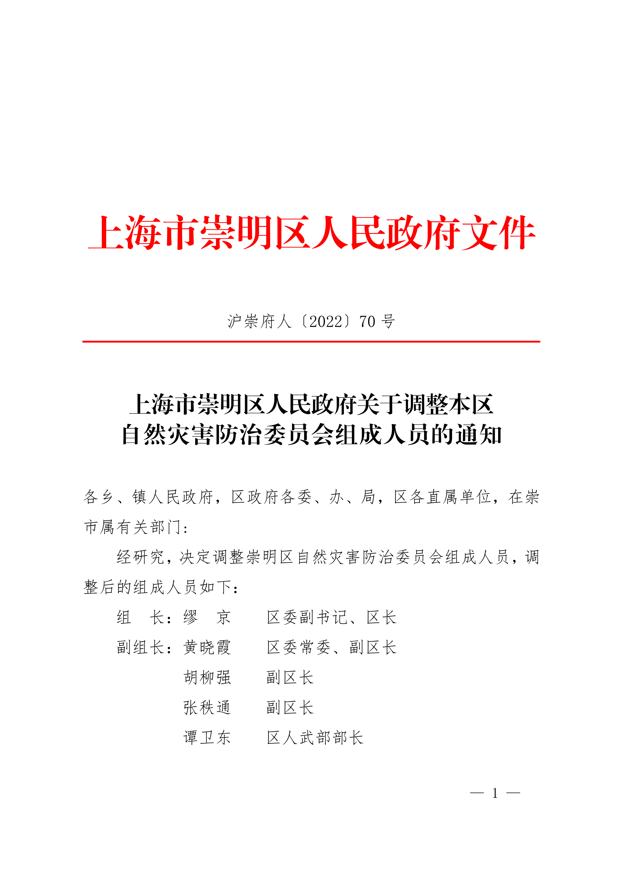 经研究,决定调整崇明区自然灾害防治委员会组成人员,调整后的组成人员如下: