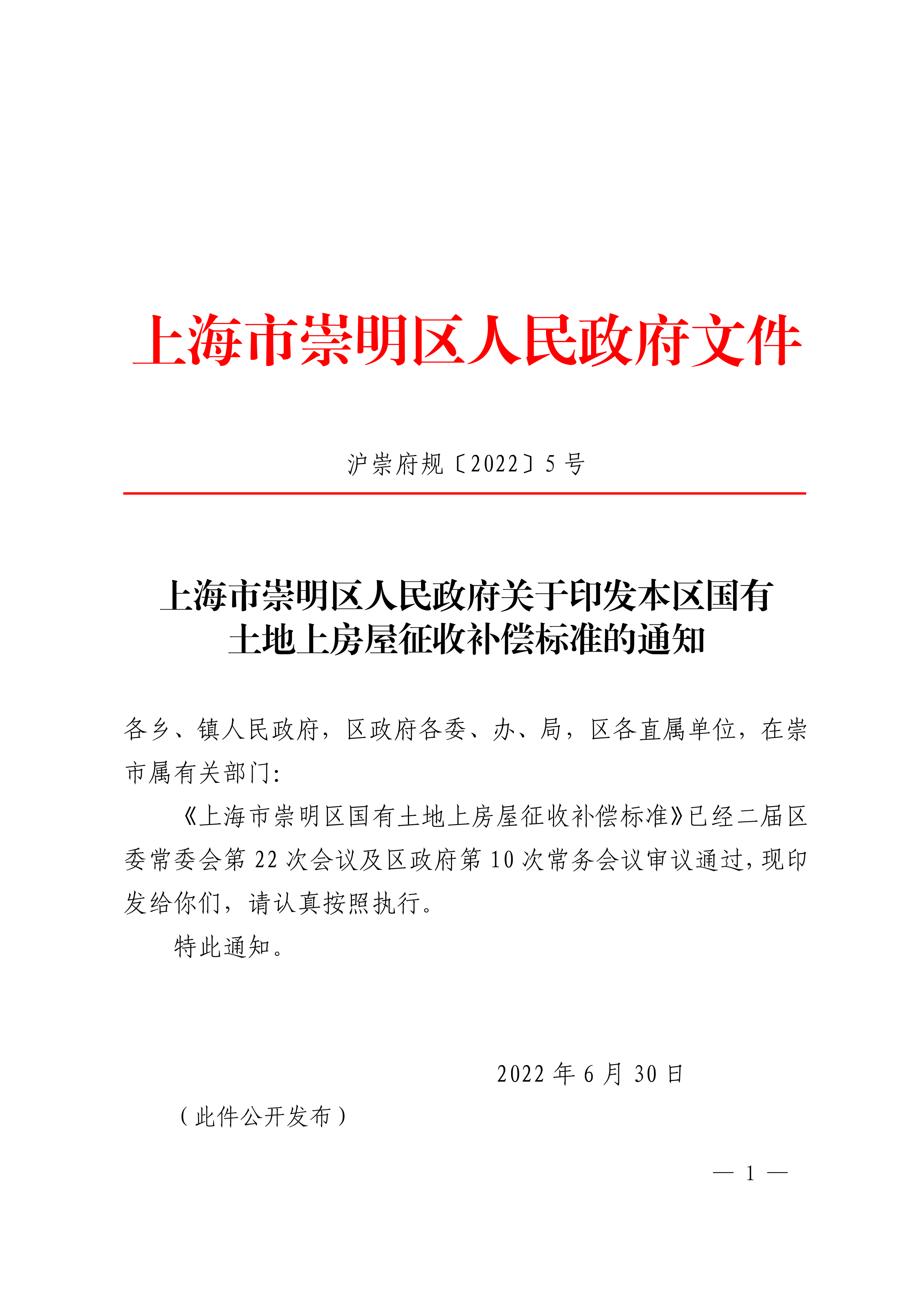 《上海市崇明区国有土地上房屋征收补偿标准》已经二届区委常委会第22次会议及区政府第10次常务会议审议通过,现印发给你们,请认真按照执行。