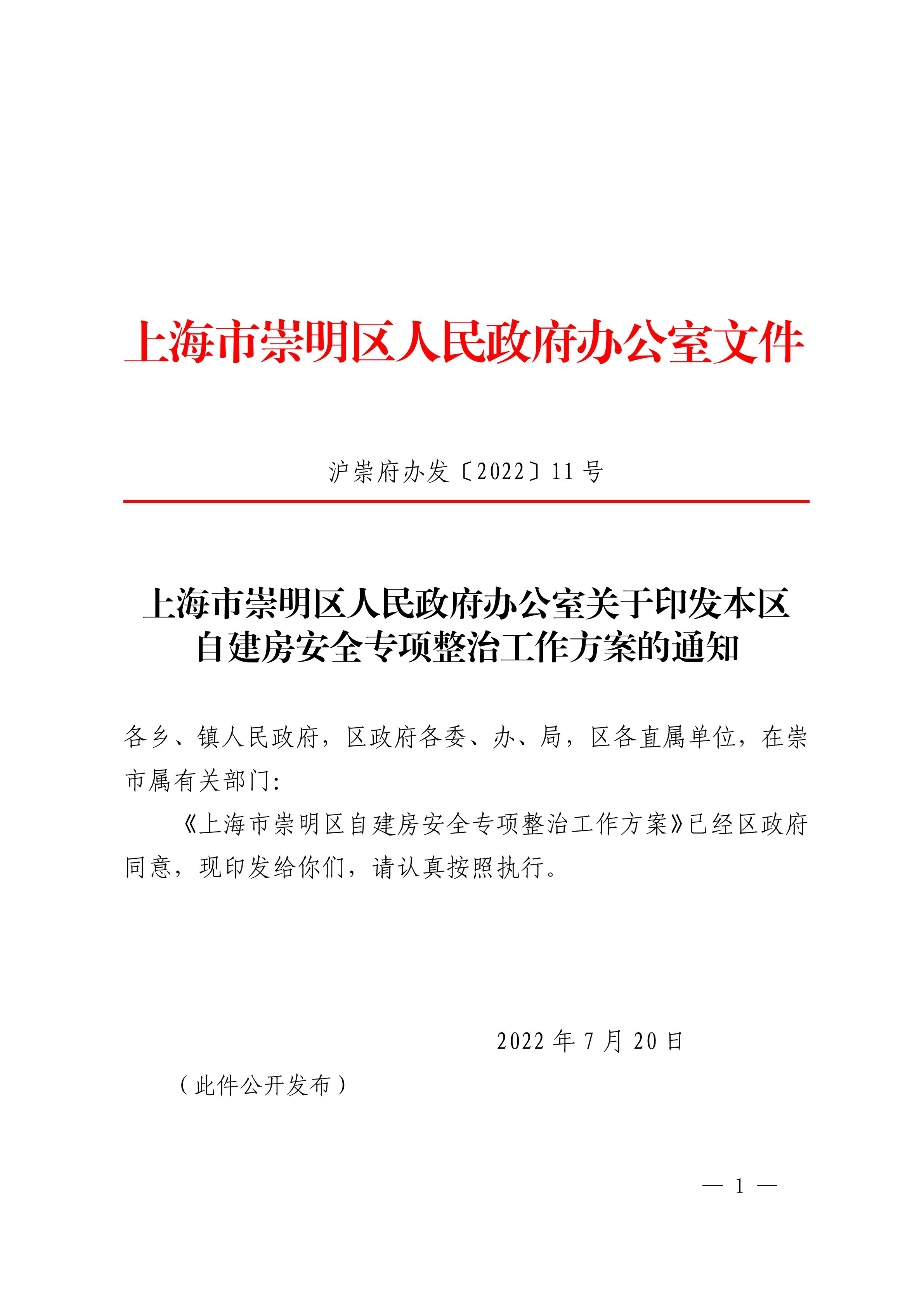 《上海市崇明区自建房安全专项整治工作方案》已经区政府同意,现印发给你们,请认真按照执行。