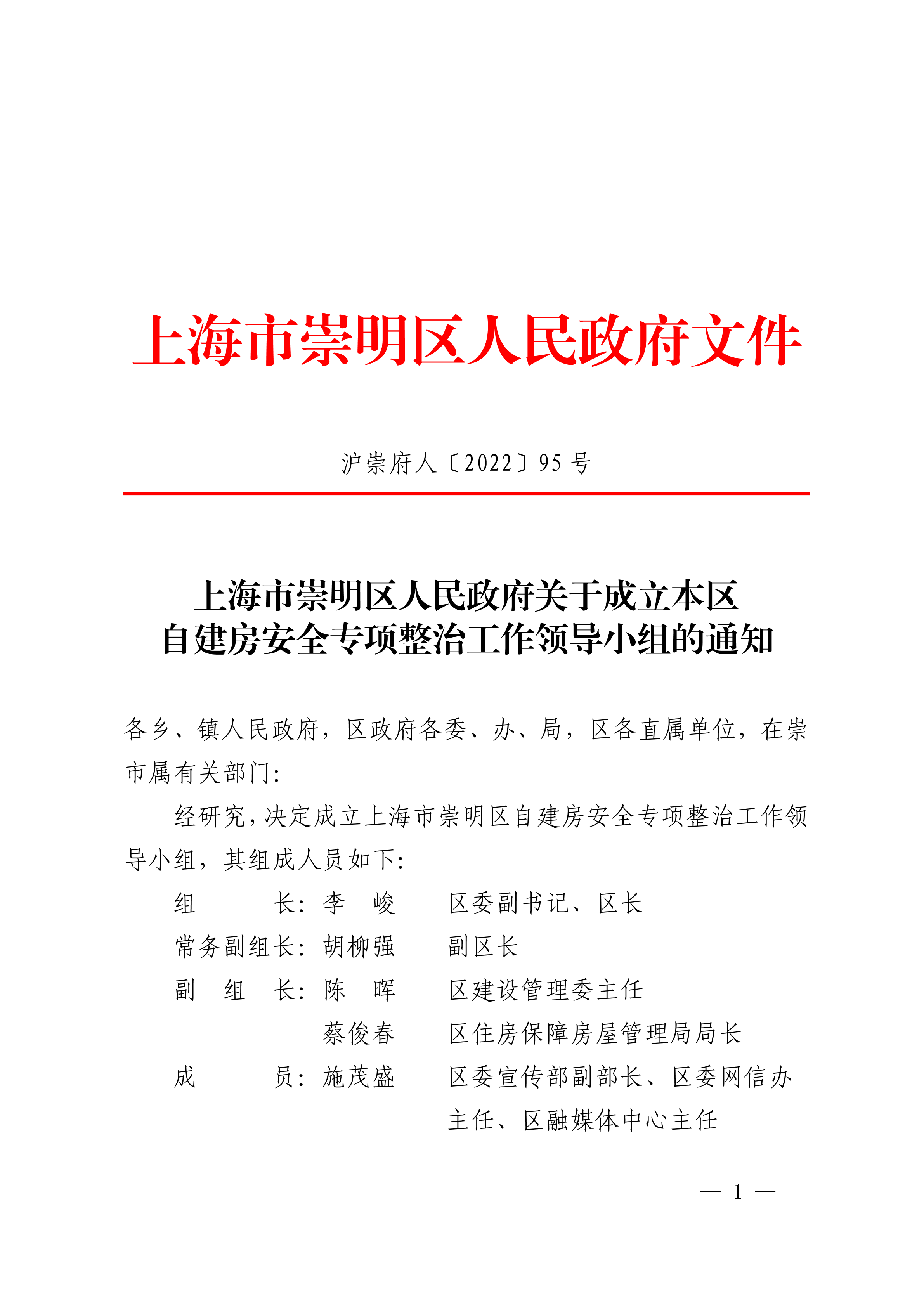 经研究,决定成立上海市崇明区自建房安全专项整治工作领导小组,其组成人员如下: