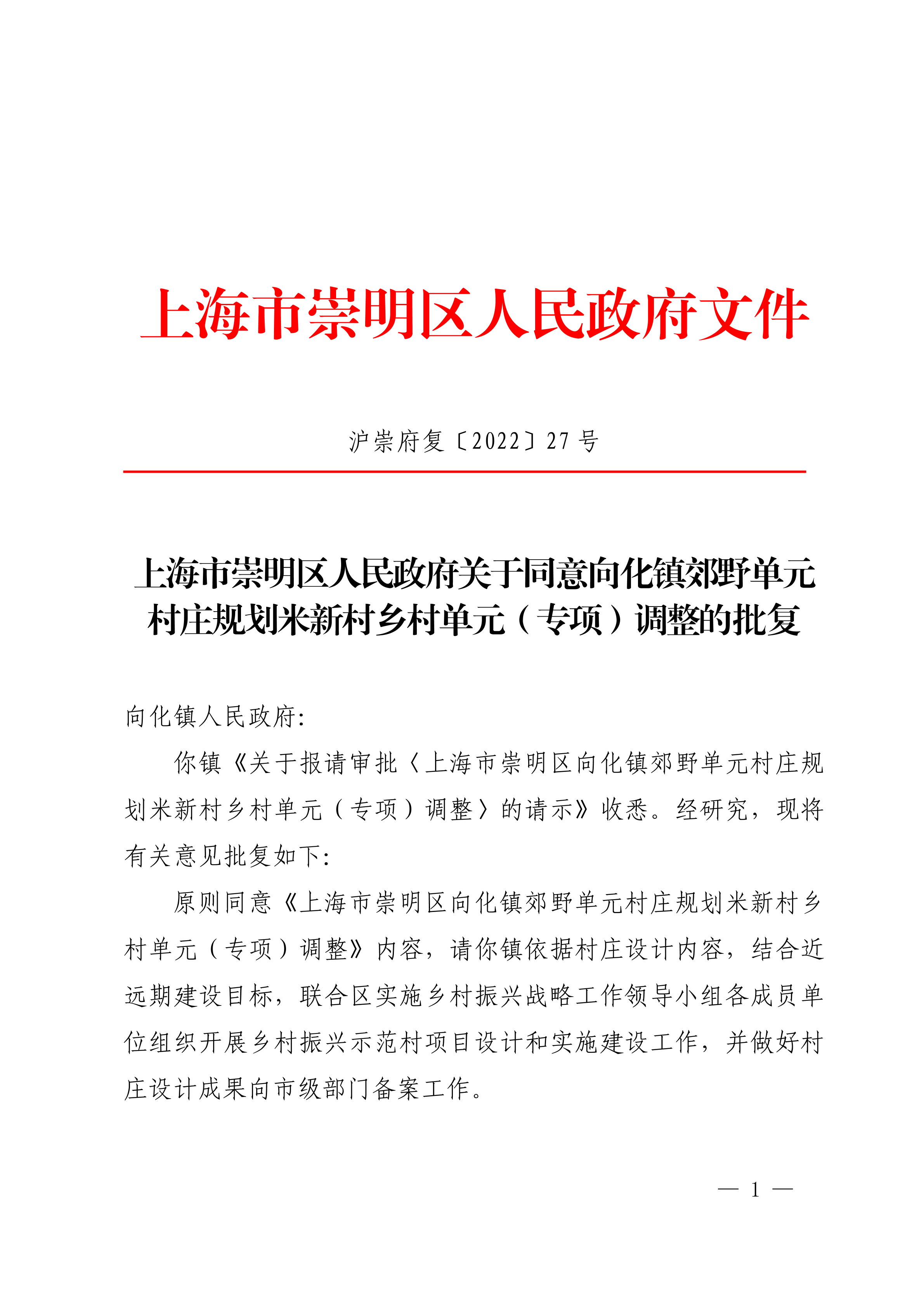 你镇《关于报请审批〈上海市崇明区向化镇郊野单元村庄规划米新村乡村单元(专项)调整〉的请示》收悉。经研究,现将有关意见批复如下: