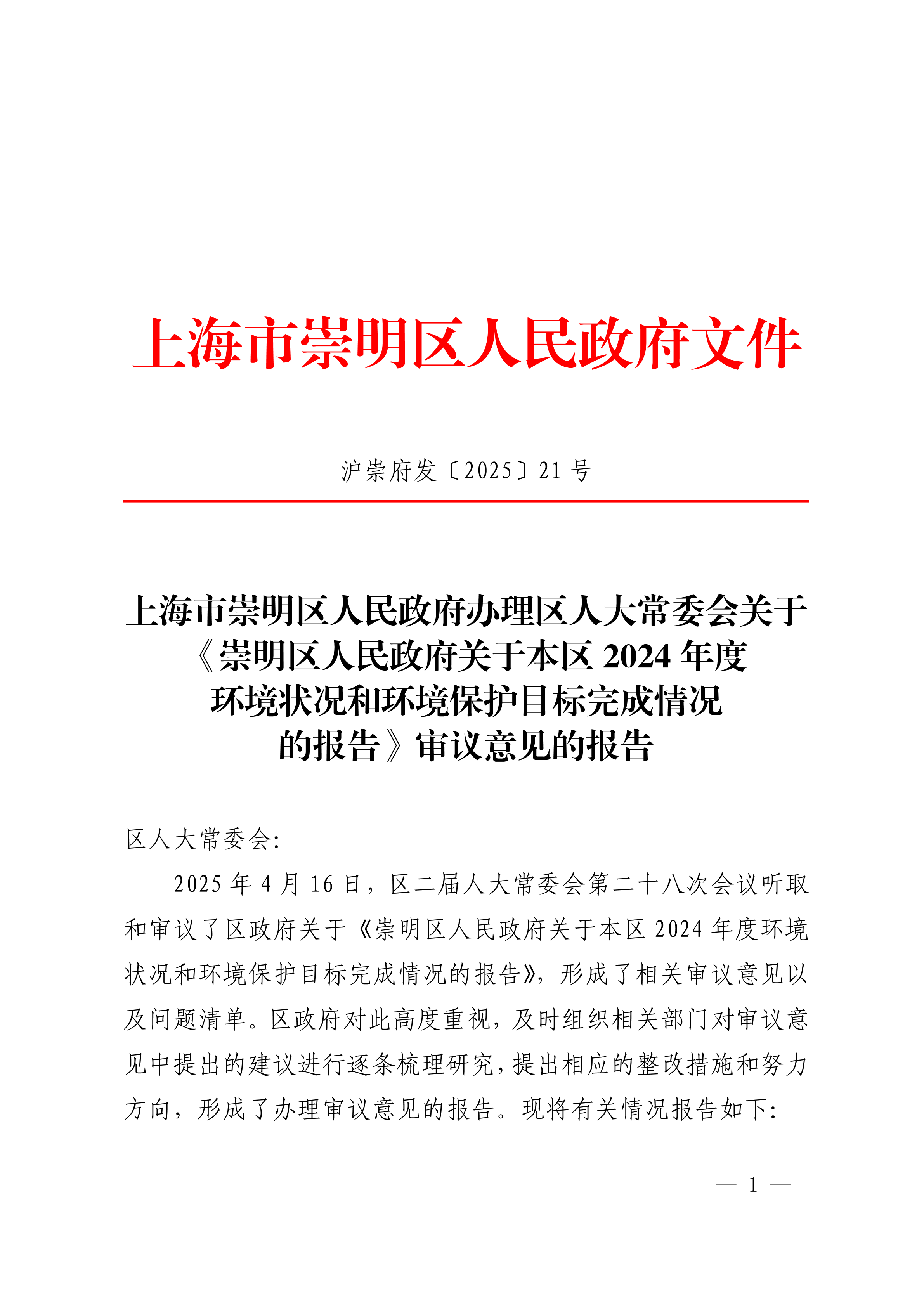 2025年4月16日,区二届人大常委会第二十八次会议听取和审议了区政府关于《崇明区人民政府关于本区2024年度环境状况和环境保护目标完成情况的报告》,形成了相关审议意见以及问题清单。区政府对此高度重视,及时组织相关部门对审议意见中提出的建议进行逐条梳理研究,提出相应的整改措施和努力方向,形成了办理审议意见的报告。现将有关情况报告如下: