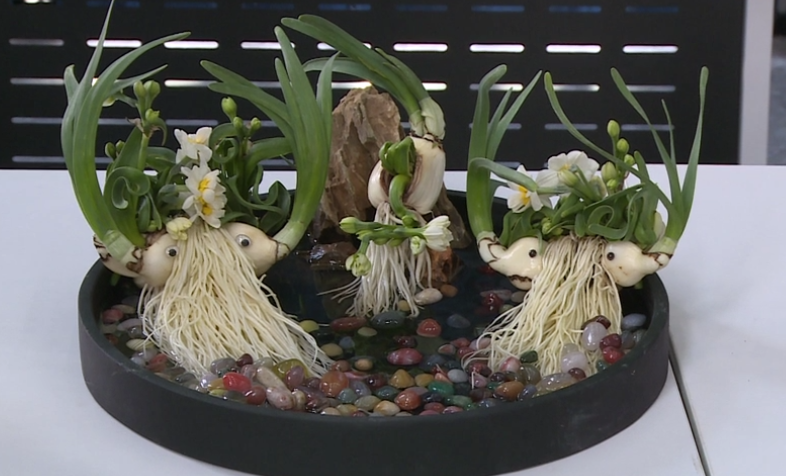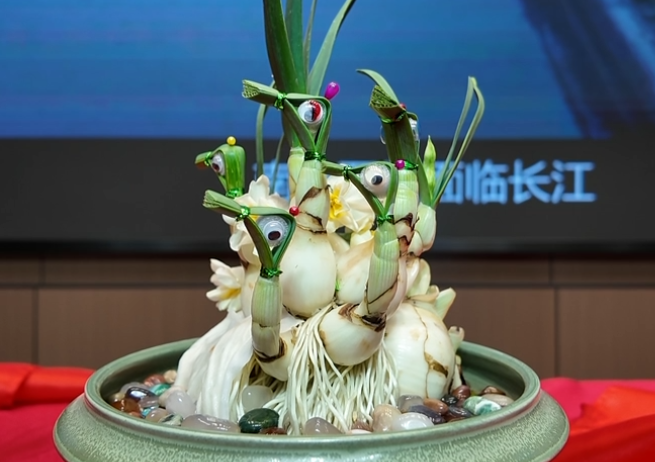 At the narcissus carving site, the rich fragrance of narcissus filled the air, captivating all who were present. Originally plain narcissus bulbs were transformed into diverse artistic treasures through the exquisite craftsmanship of artisans. Some took the form of cranes poised for flight; others stood gracefully like elegant egrets; still others were sculpted into auspicious flower baskets or delicate golden cups... Through the artisans’ careful guidance of the growth direction of the roots, stems, and leaves, each narcissus bulb became a perfect fusion of natural texture and artistic creativity, forming a unique design. The exquisite narcissus floral art attracted many visitors, who took out their phones to capture photos, preserving the elegance and fragrance of winter.