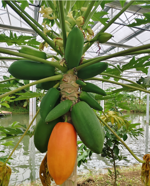 步入农场温室大棚,一派生机勃勃的“南国风光”映入眼帘:步道两旁,翠绿高大的香蕉树缀满果实;青玉色的木瓜在枝头挤挨,表皮泛出蜜蜡般光泽;一颗颗荔枝染红树梢,散发清新果香。凭栏俯视,潺潺流水间,鸭嘴鱼、鲈鱼在丰茂水草间嬉戏。这一“南果北移”与“北果南迁”共存的奇观,正是农场智慧科技的核心成果。