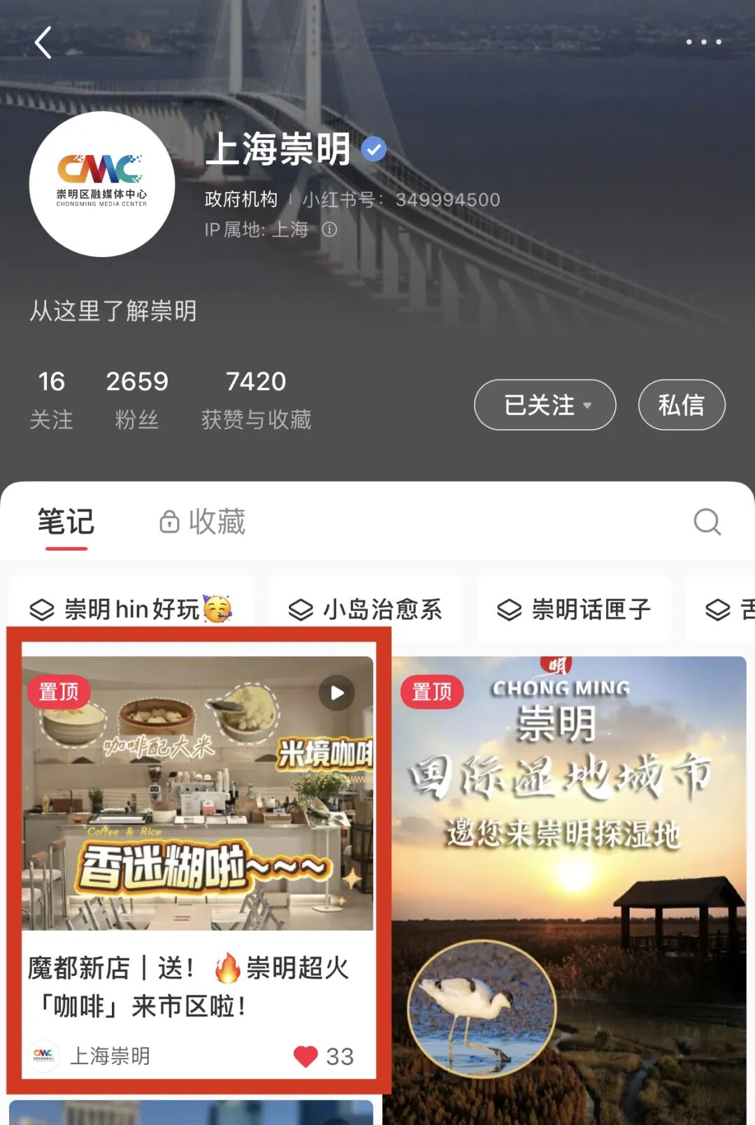 打开“上海崇明”小红书,找到置顶视频。