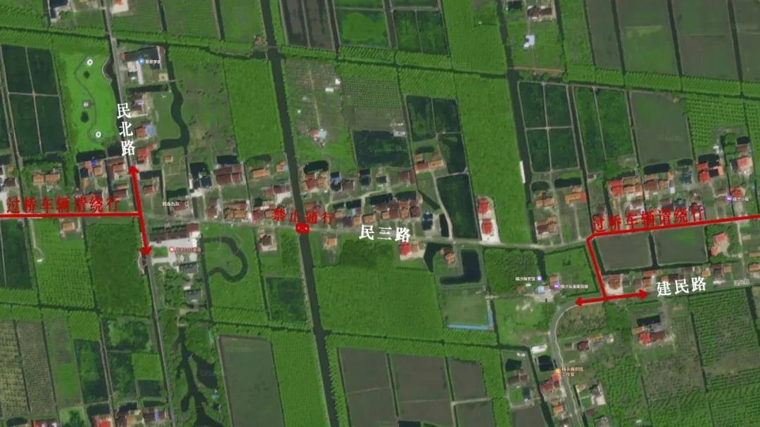 施工期间由西向东过桥车辆请于民北路绕行,由东向西过桥车辆请于建民路绕行,具体情况如下图所示。