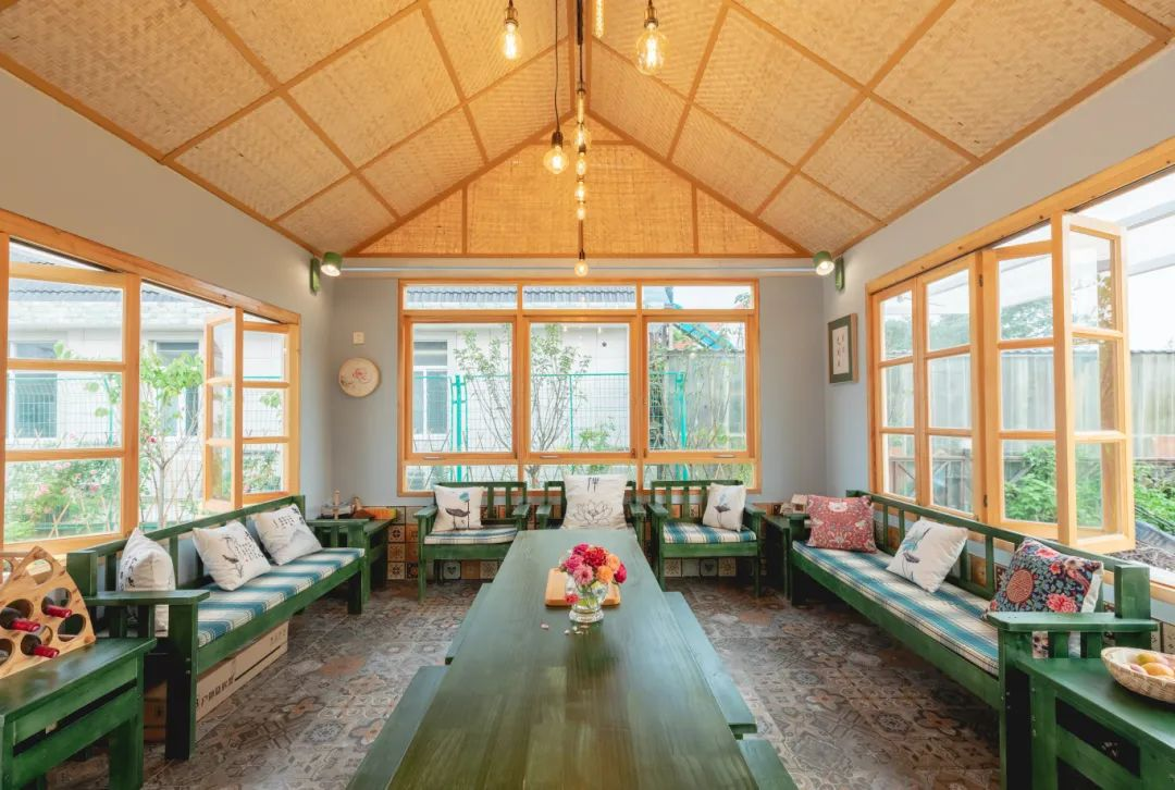 藏匿于深幽密林之间的“归屿”民宿,精致的花园绿茵如毯,百花争艳,后院的银杏树下摆放的长桌专供客人烧烤聚餐。