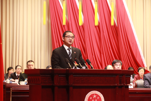 区委副书记、区长李政在热烈的掌声中,代表崇明区人民政府向大会作政府工作报告。
