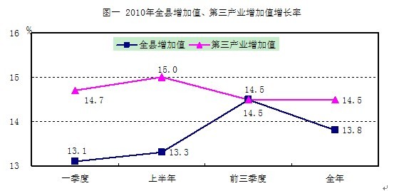 综合经济实力持续增强。全县增加值自2003年以来连续8年保持两位数增长,总量接近200亿元。工、农业总产值分别达376.4亿元和52.8亿元。第三产业增加值增幅高出全县增加值增幅0.7个百分点(见图一),县级财政收入增幅高出全县增加值增幅6.0个百分点。