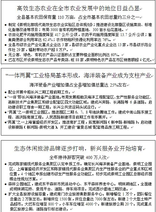 加快发展现代服务业。稳步推进长兴海洋装备产业基地生产性服务业功能区、陈家镇现代服务业集聚区筹备建设工作。启动建设崇明工业园区总部经济园项目。编制《崇明旅游发展总体规划》。启动建设东平国家森林公园二期核心区。明珠湖-西沙湿地申报创建国家4A级景区。