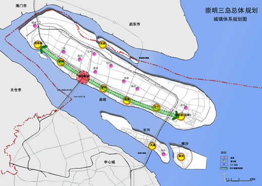 9个新市镇 —— 包括堡镇、凤凰、新河、向化、庙镇5个综合型新市镇和陈家镇、明珠湖、北湖、新民4个休闲型新市镇,规划总人口42.5万。其中,崇南链状新市镇群将成为三岛经济和人口集中的主要导入地带。