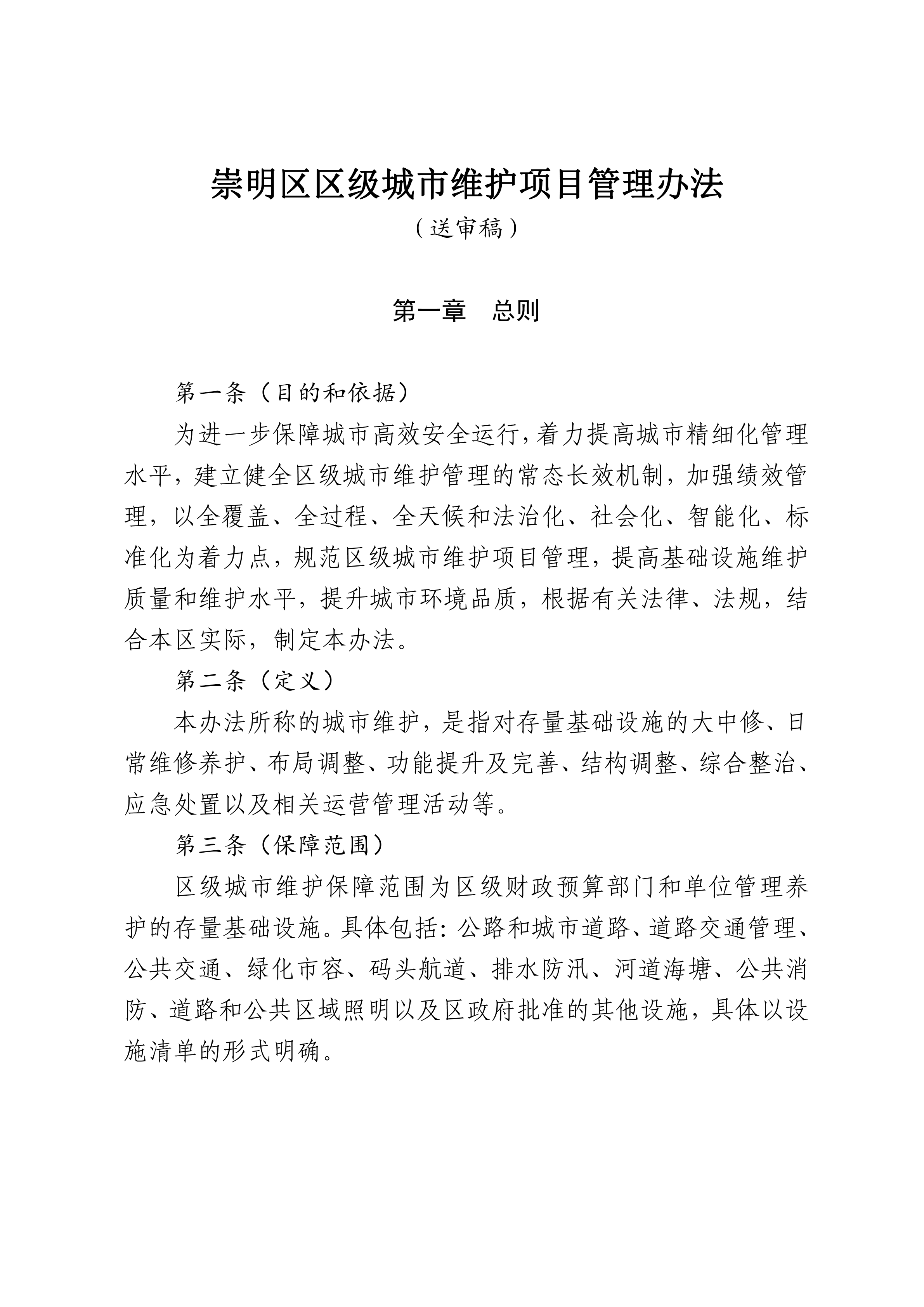 为全面贯彻落实市委、市政府关于不断提高城市基础设施维护管理精细化水平的有关精神以及《关于进一步加强本市城市维护工作若干意见的通知》(沪府办发〔2019〕18号)和《上海市人民政府关于批转市住房城乡建设管理委市财政局制订的<上海市市级城市维护项目管理办法>的通知》(沪府规〔2020〕1号)的要求,践行“人民城市人民建,人民城市为人民”重要理念,进一步加强本区城市维护项目管理,提高基础设施维护保障水平,结合崇明实际,已形成《崇明区区级城市维护项目管理办法(草案)》(征求意见稿),为进一步完善、优化,现向社会公众征求意见。