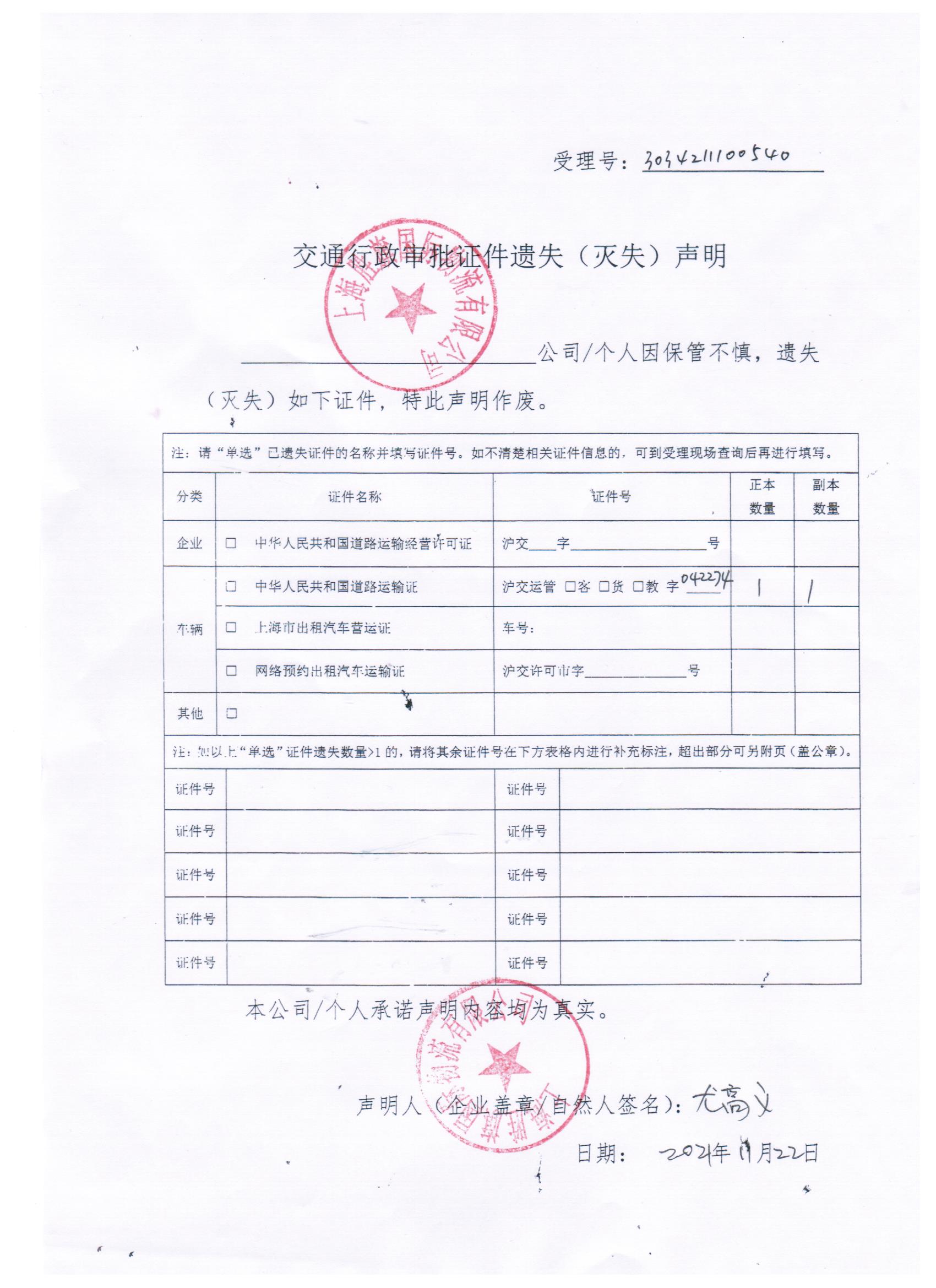 上海胜旗国际物流有限公司道路运输证(证件号:沪交运管货字042274)遗失声明