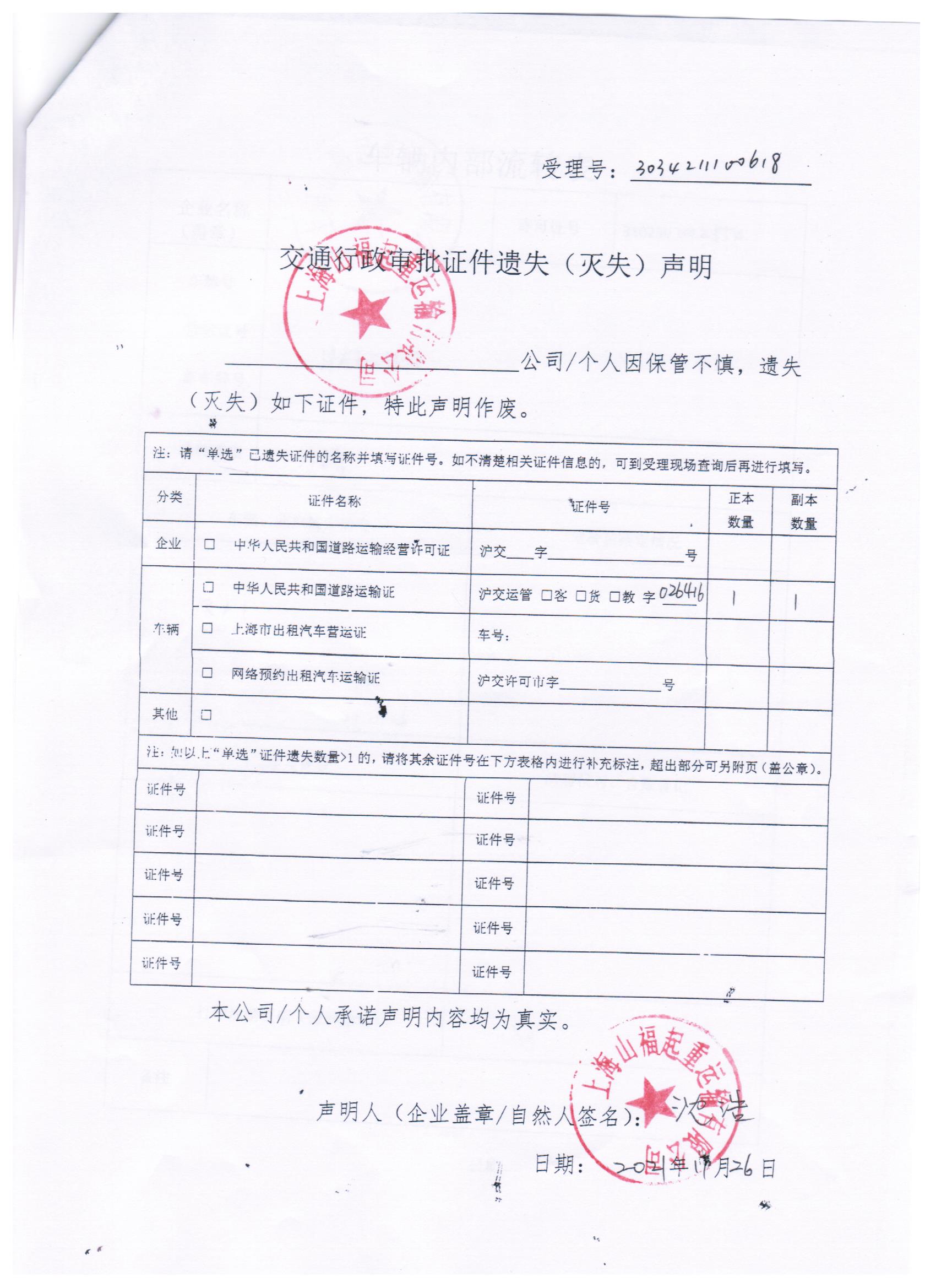 上海山福起重运输有限公司道路运输证(证件号:沪交运管货字026416)遗失声明