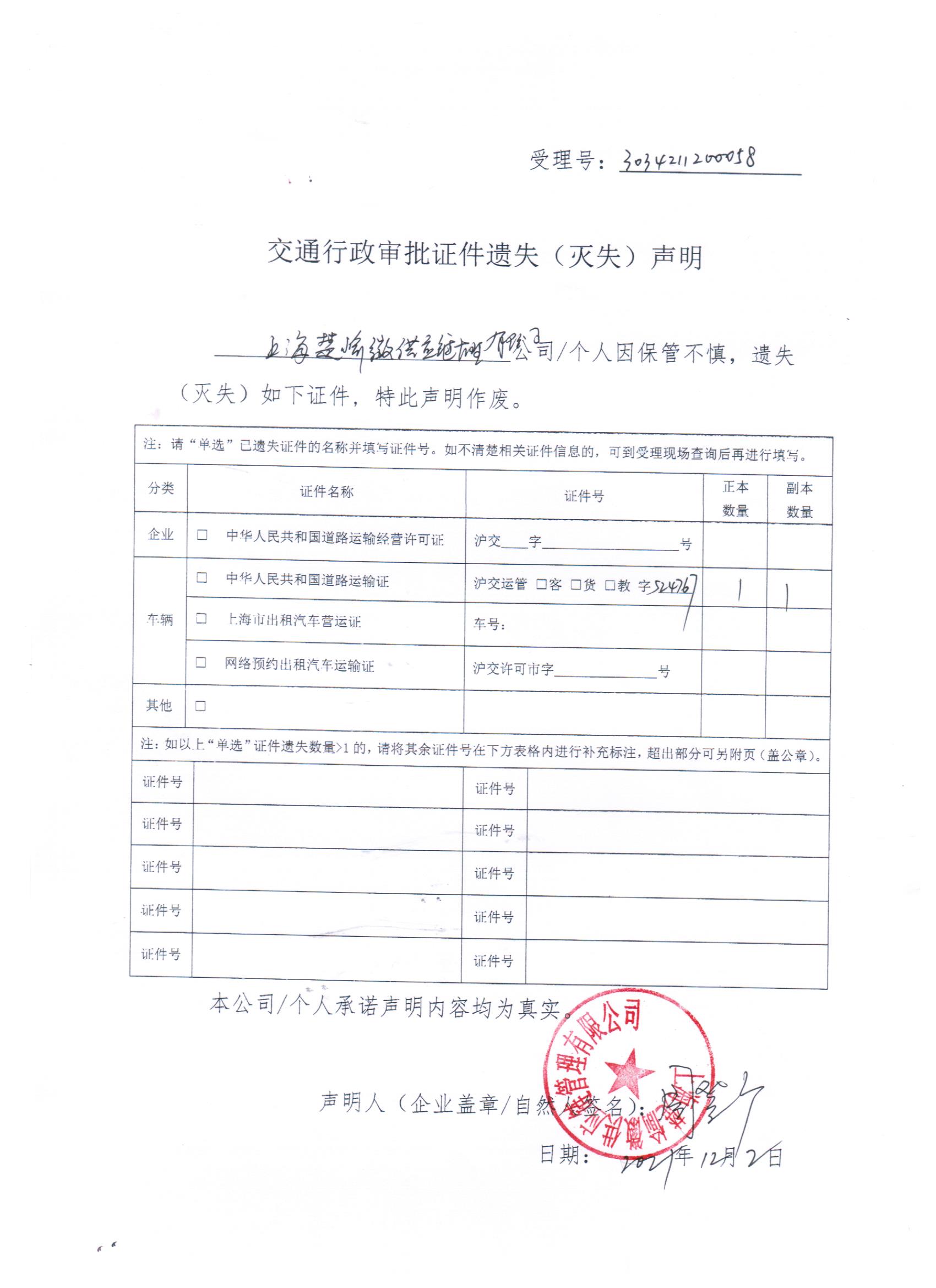 上海楚愉徽供应链管理有限公司道路运输证(证件号:沪交运管货字524767)遗失声明
