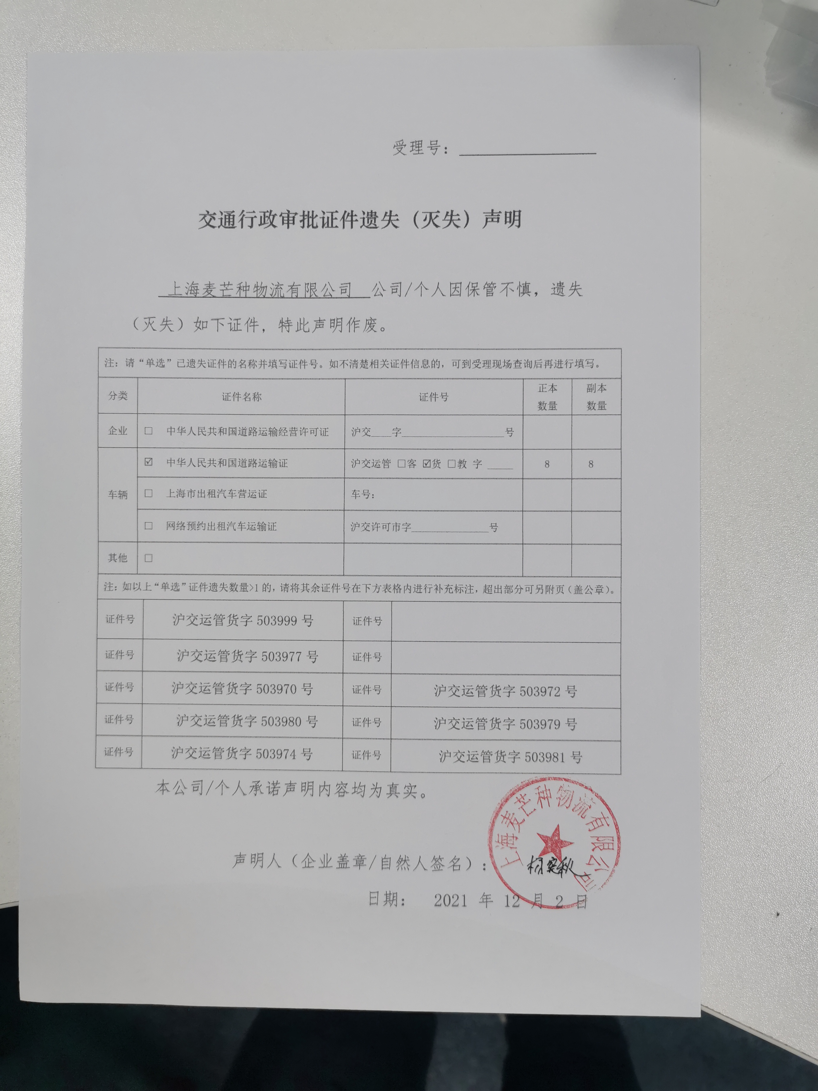 上海麦芒种物流有限公司道路运输证(证件号:沪交运管货字503999等8本)遗失声明