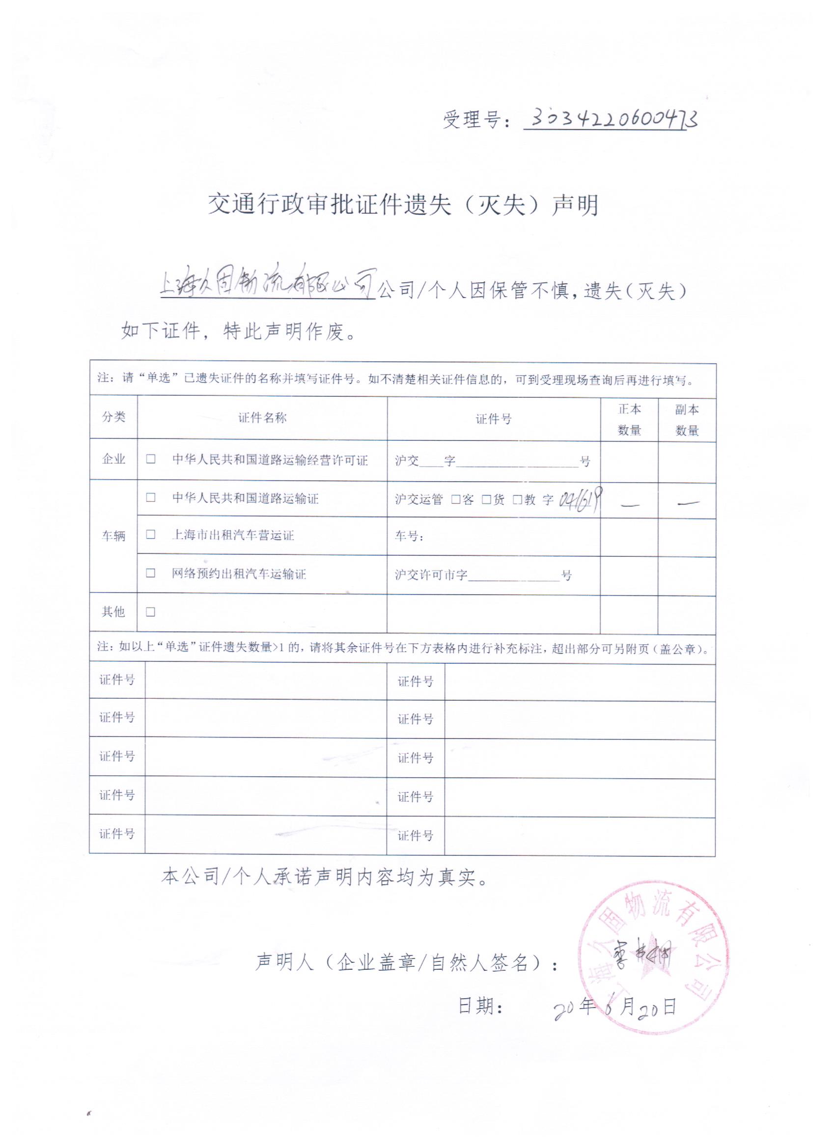 上海久固物流有限公司道路运输证(证件号:沪交运管货字041619)遗失声明