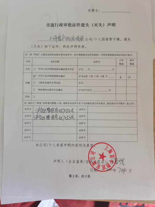 上海富冬物流有限公司道路运输证(证件号:沪交运管货字457054等2本)遗失声明