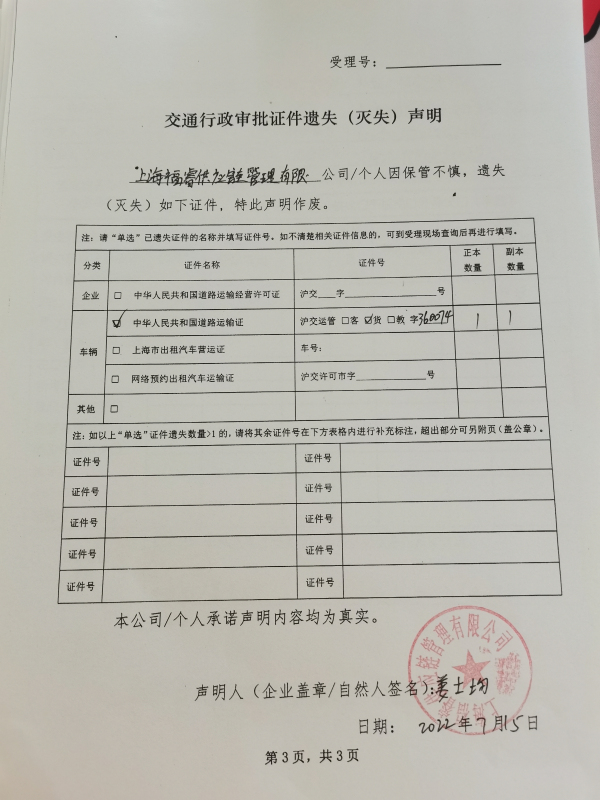 上海福睿供应链管理有限公司道路运输证(证件号:沪交运管货字360074)遗失声明